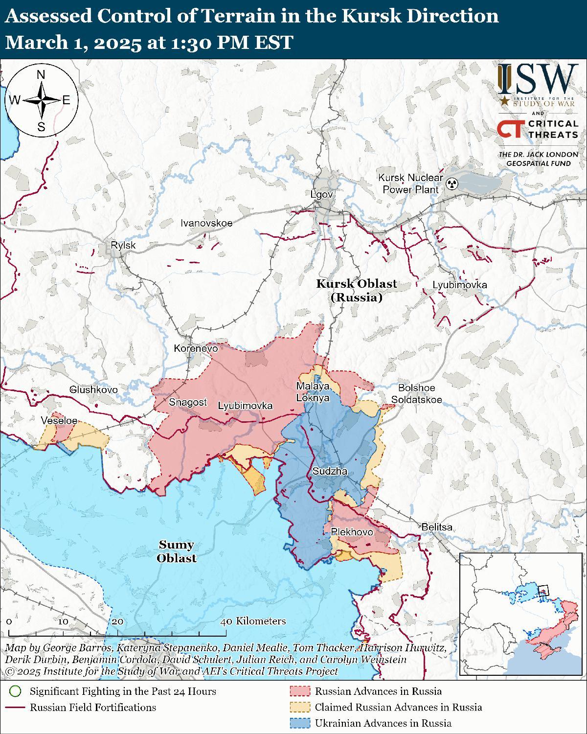 1 марта враг продолжил наступательные действия вдоль Украинского выступа в Курской области, но не добился подтвержденных успехов. 28 февраля и 1 марта российские войска продолжили атаки к северо-западу от Суджи в районе Лебедевки и к северу от Суджи в районах населенных пунктов Малая Локня, Викторовка и Новая Сорочина. [21]