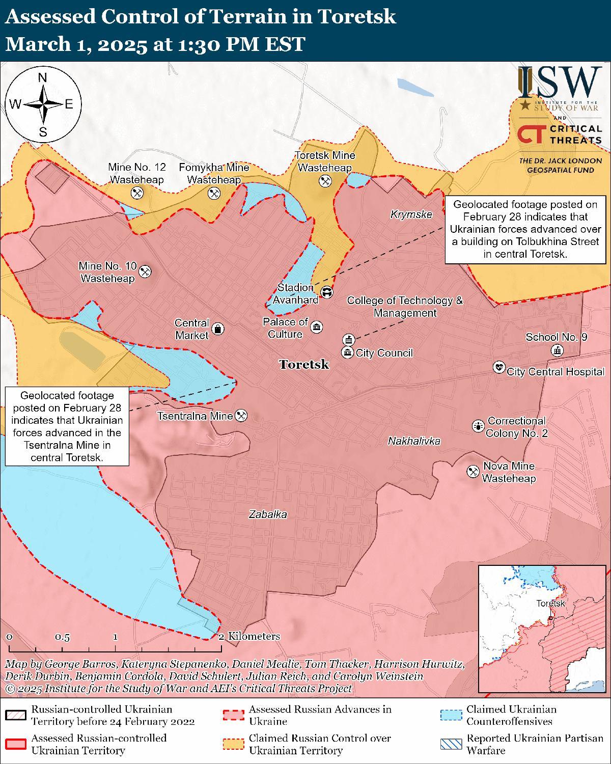 Оценка украинского продвижения: Геолоцированные кадры, опубликованные 28 февраля, указывают на то, что украинские войска недавно продвинулись в районе улицы Толбухина и в районе шахты «Центральная» (оба в центре Торецка). [43]