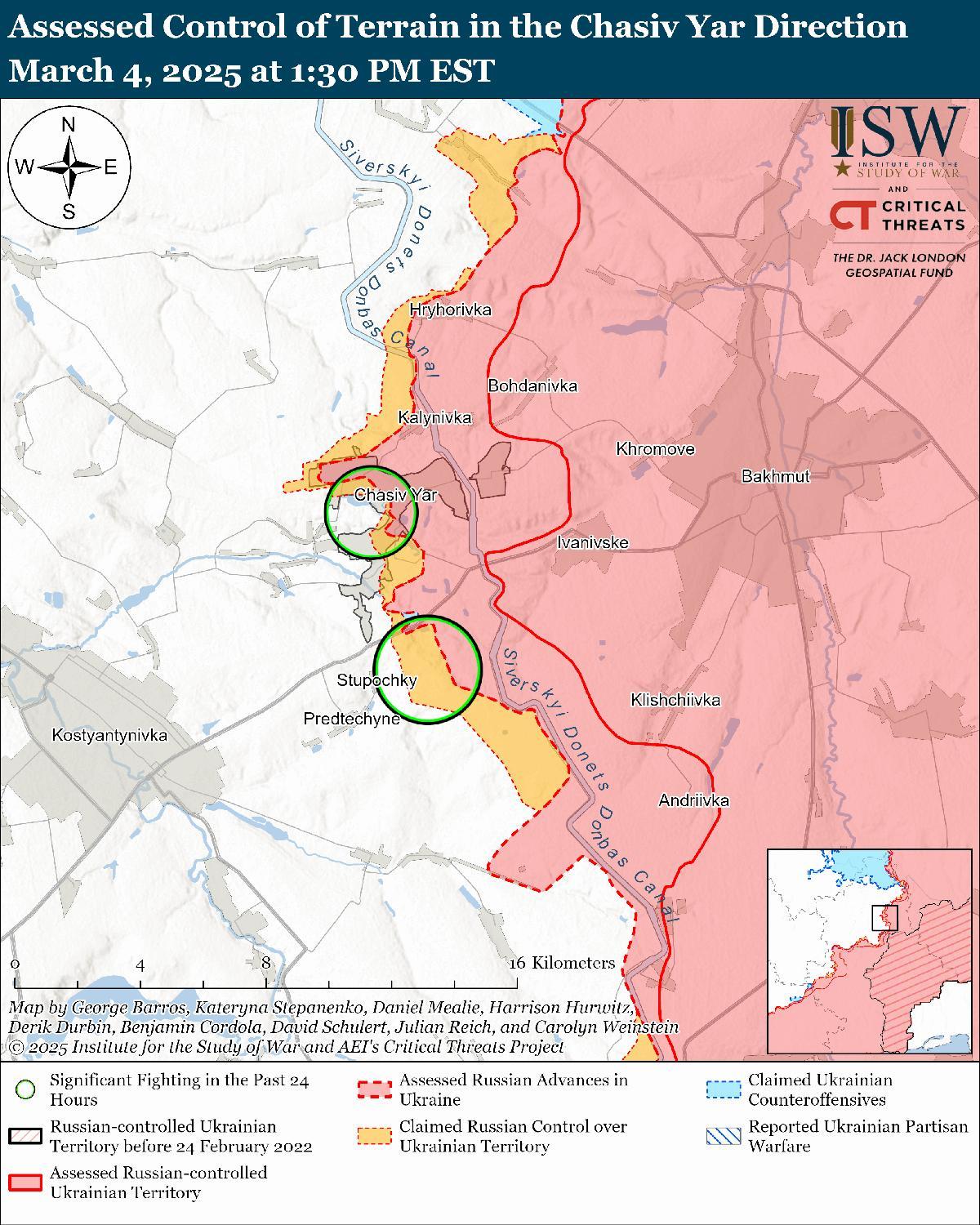 Неподтвержденные утверждения: 4 марта российский военный блогер заявил, что российские войска продвинулись в южной части Часова Яра. [66]