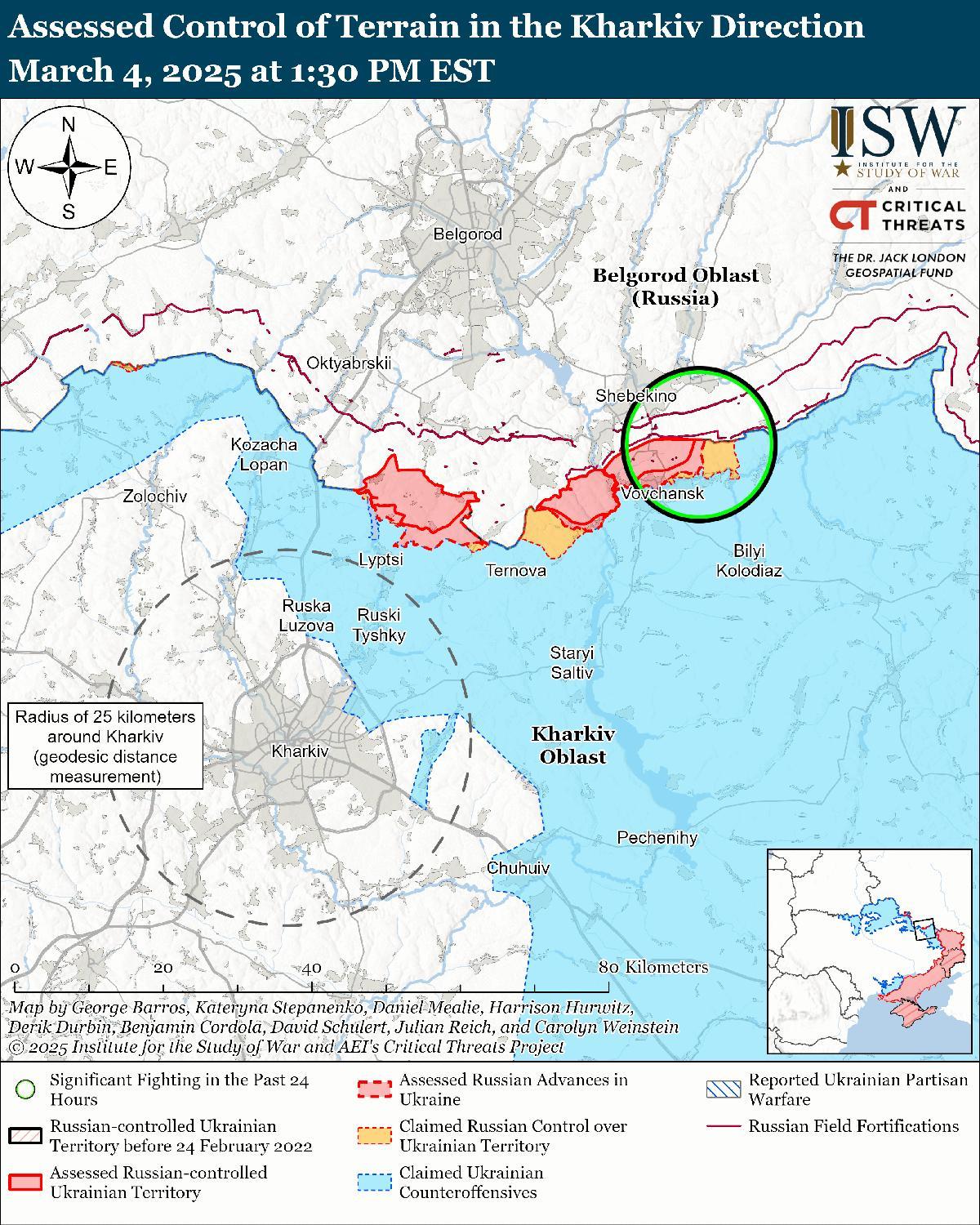 Оценка российского наступления: 4 марта Генеральный штаб Украины опубликовал карту, на которой указано, что российские войска продвинулись к востоку от Загрызово (к северо-востоку от Боровой). [56]