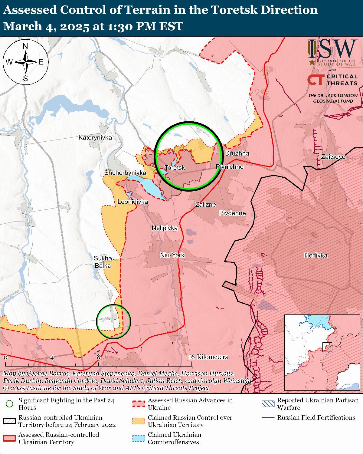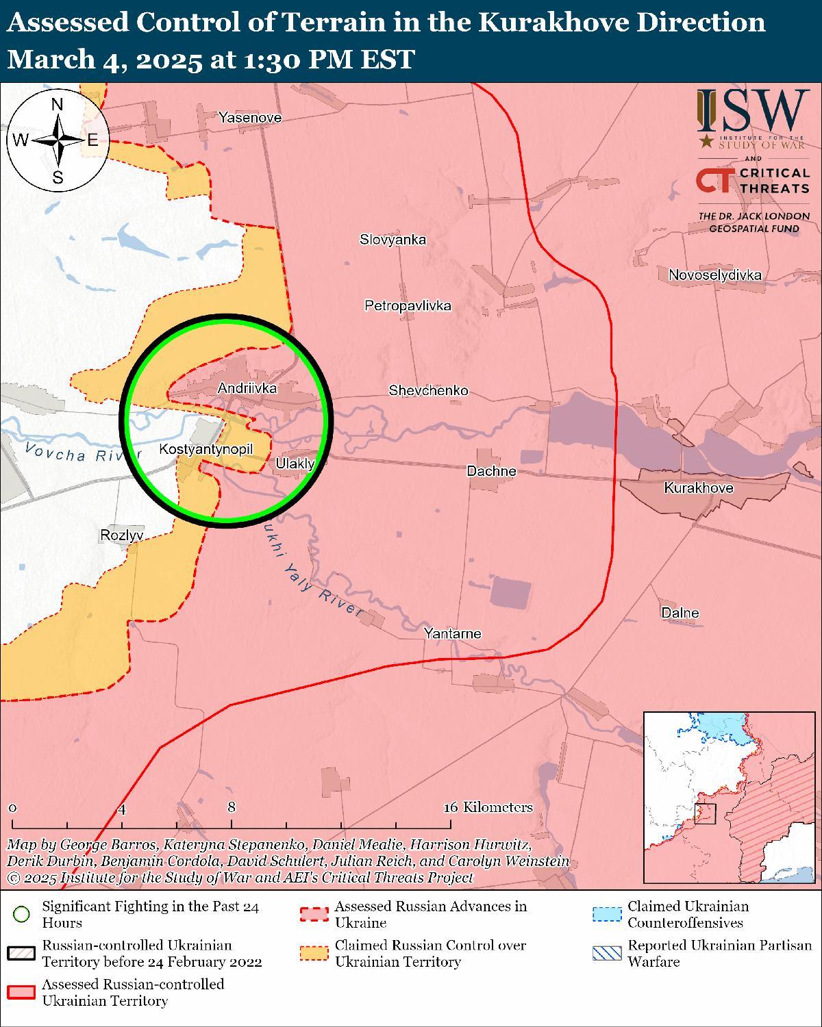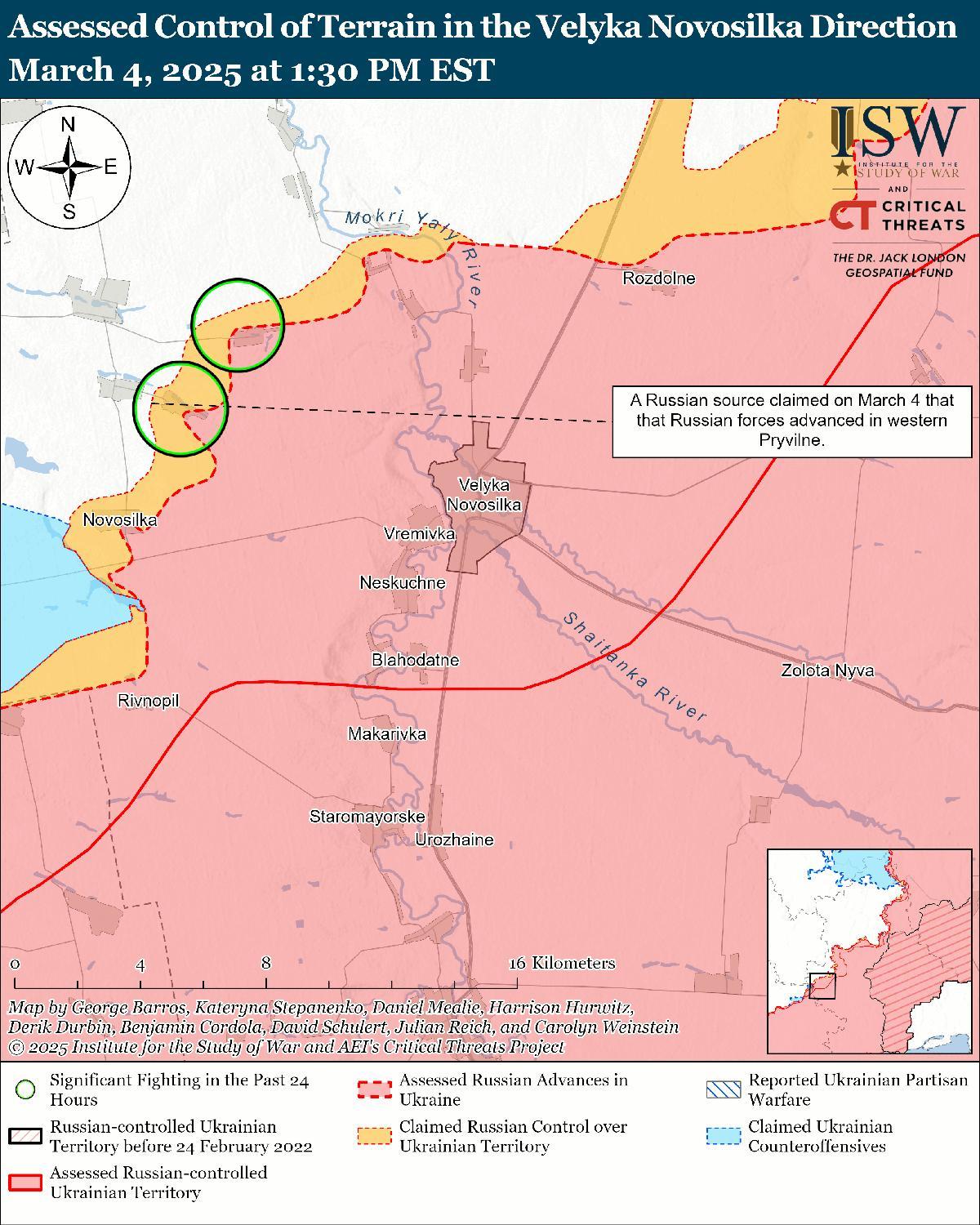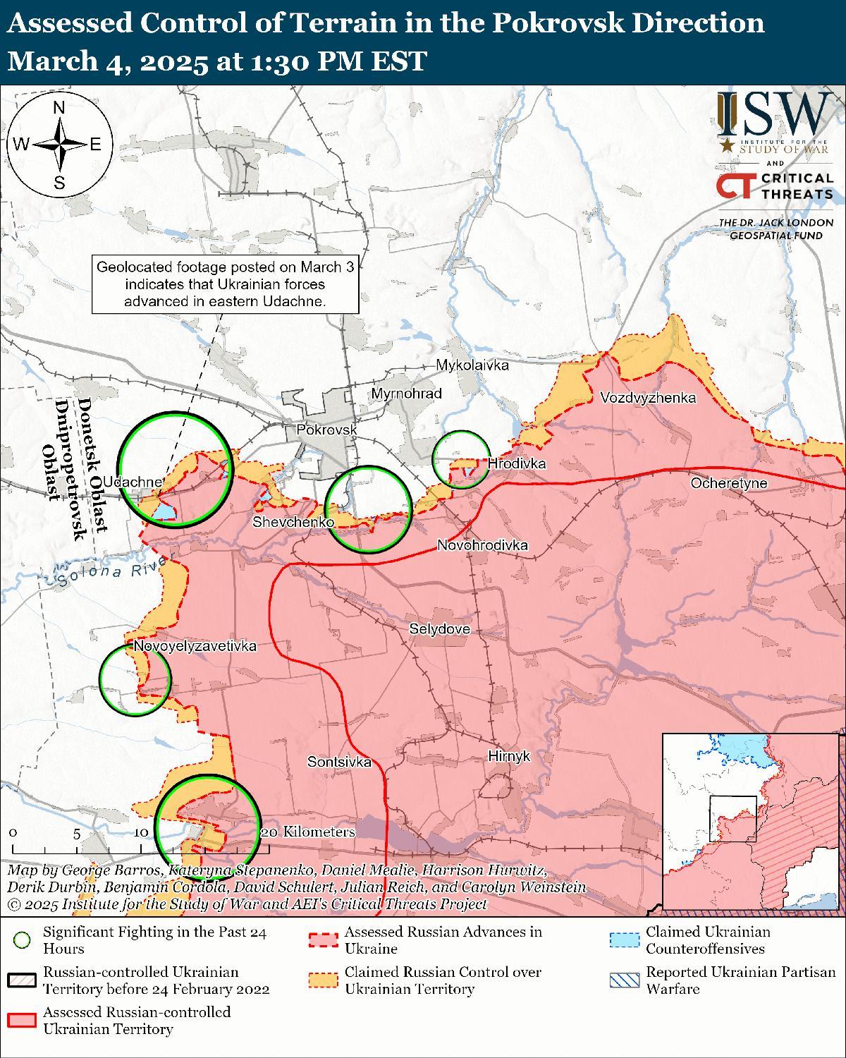 Оценка российского продвижения: 4 марта Генеральный штаб Украины опубликовал карту, на которой указано, что российские войска продвинулись к востоку от Преображенки (к юго-западу от Покровска). [74]