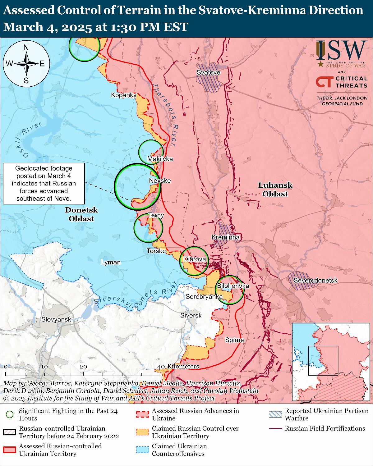 Оценка российского продвижения: Геолоцированные кадры, опубликованные 4 марта, указывают на то, что российские войска недавно продвинулись к юго-востоку от Новое (к северо-востоку от Лимана). [61]
