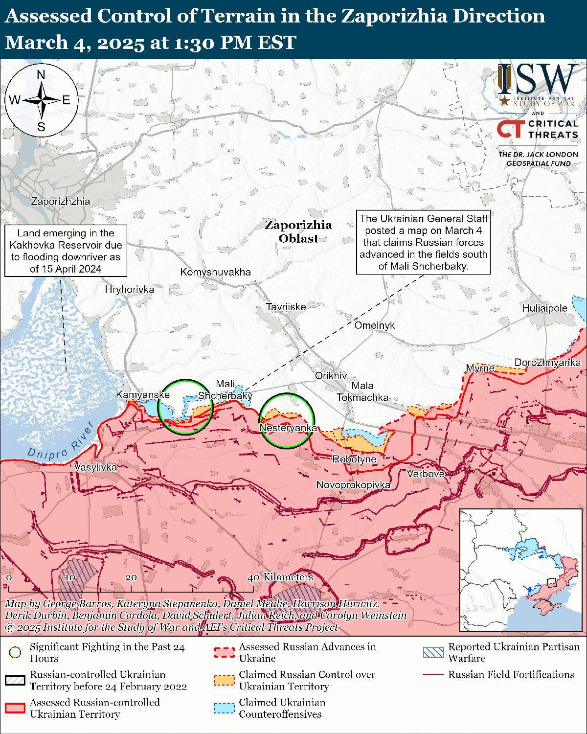 Оценка российского продвижения: 4 марта Генеральный штаб Украины опубликовал карту, на которой указано, что российские войска недавно продвинулись на полях к югу от Малые Щербаки (к северо-западу от Работино). [86]