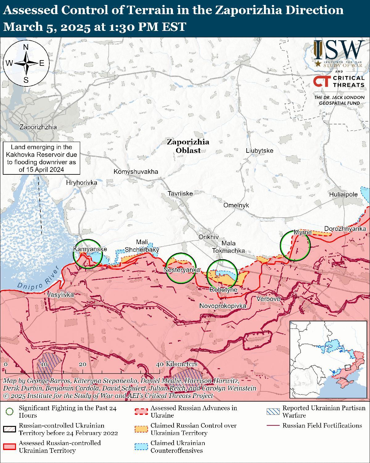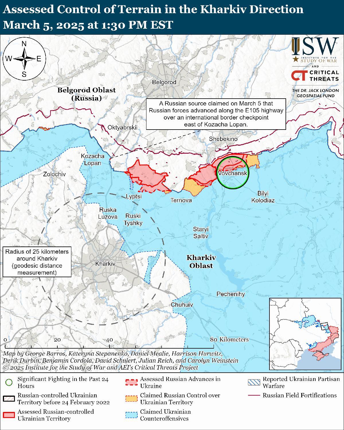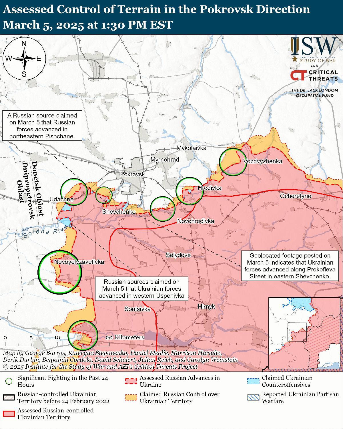 Оценка украинского продвижения: На геолоцированных кадрах, опубликованных 5 марта, видно, как российские войска наносят удары по нескольким украинским бронемашинам в восточной части Шевченко (к югу от Покровска), что указывает на то, что украинские войска недавно продвинулись в этом районе. [63] Российский военный блогер утверждал, что украинские войска израсходовали до батальона бронетехники при наступлении на Шевченко, но ISW не может независимо подтвердить это утверждение. [64] Российские военные блогеры утверждали, что украинские войска продвинулись в районе Успеновки (к юго-западу от Покровска) и к северному (правому) берегу реки Солона на западе Новосергиевки (к северу и западу от Успеновки). [65]