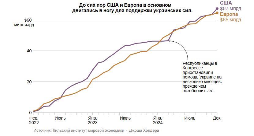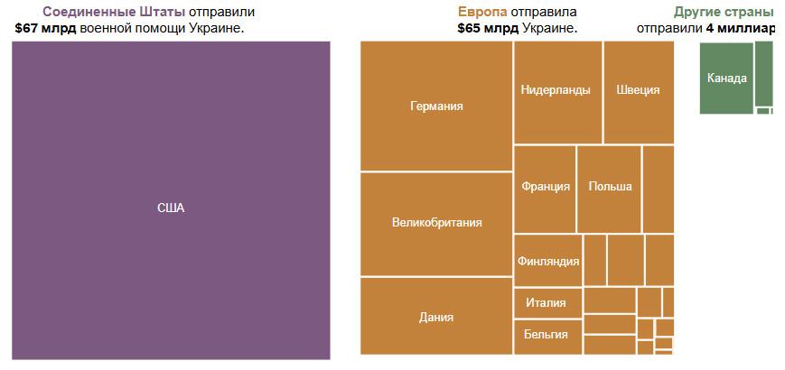 По данным Кильского института мировой экономики, немецкой исследовательской организации, из 136 миллиардов долларов военной помощи, которую союзники предоставили Украине с начала полномасштабного вторжения России в феврале 2022 года до конца прошлого года, почти половина поступила из Соединенных Штатов.