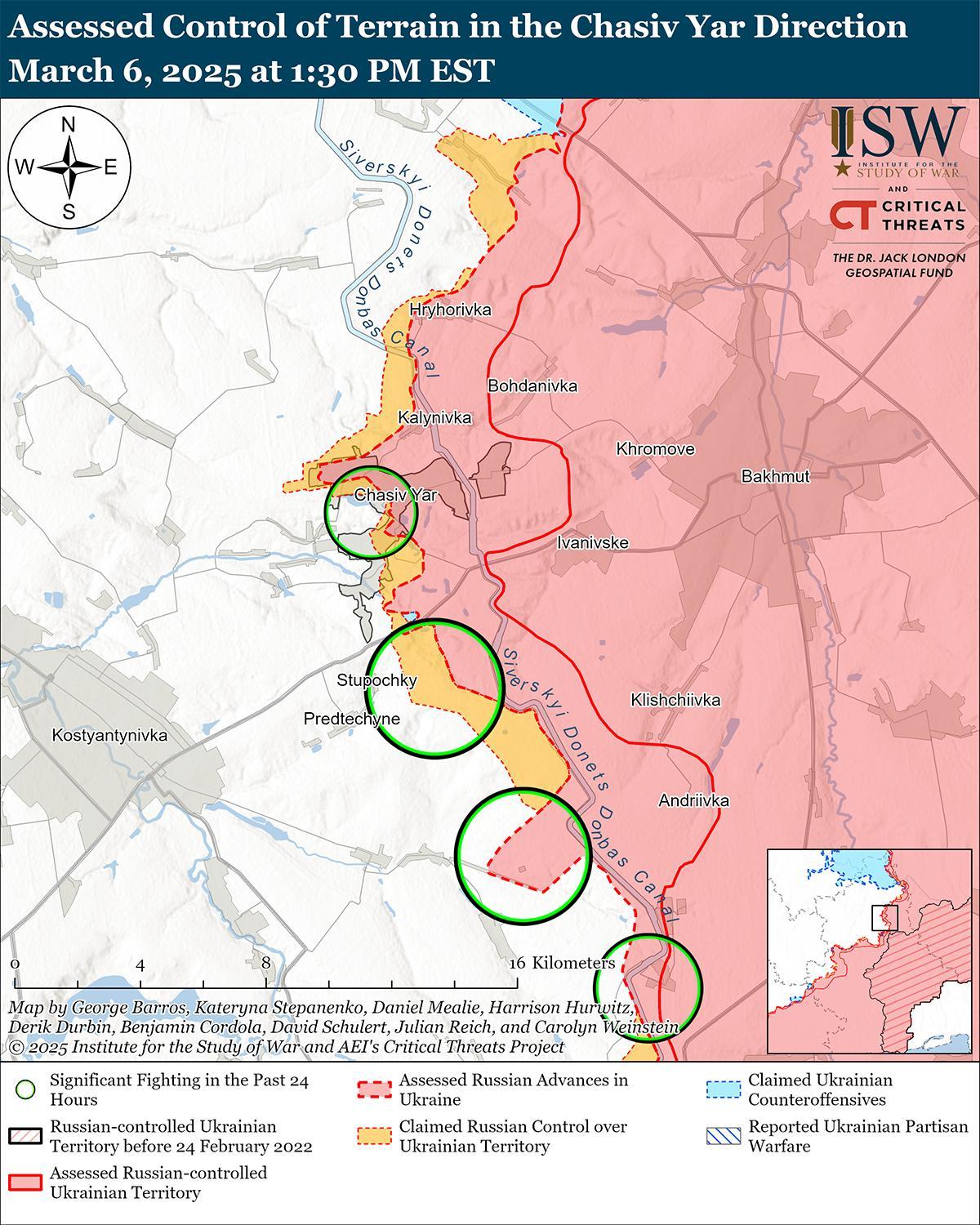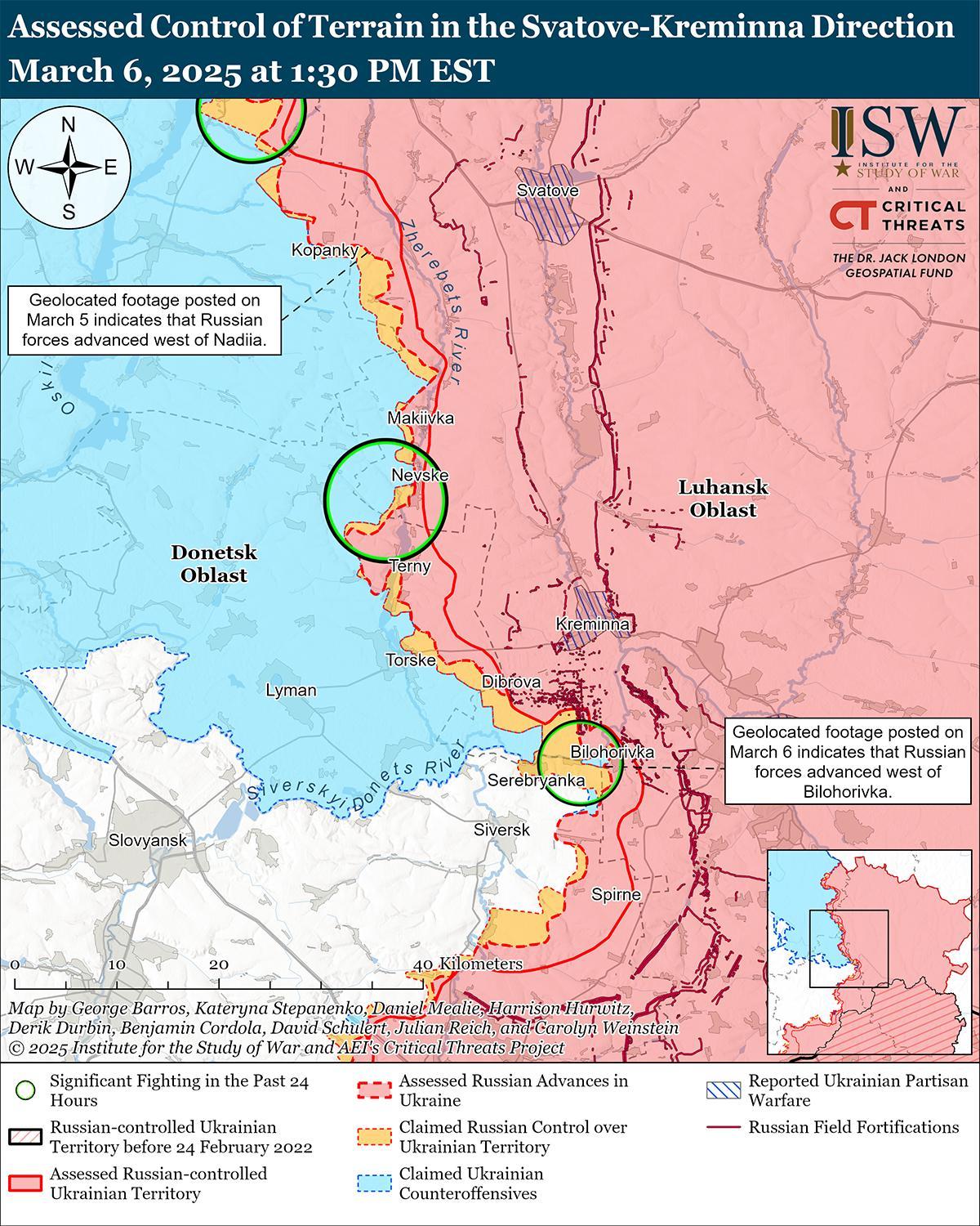 Оценка российского продвижения: геолоцированные кадры, опубликованные 6 марта, указывают на то, что российские войска недавно продвинулись к западу от Белогоровки (к северо-востоку от Северска). [62]