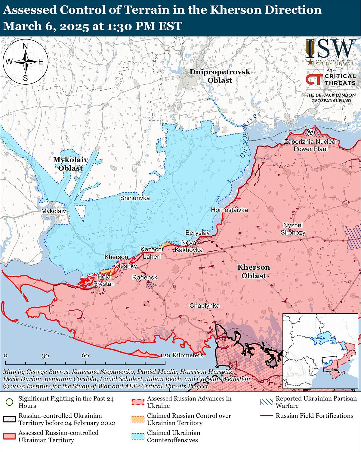 Ни украинские, ни российские источники не сообщали о наземных атаках россиян на Херсонском направлении 6 марта.