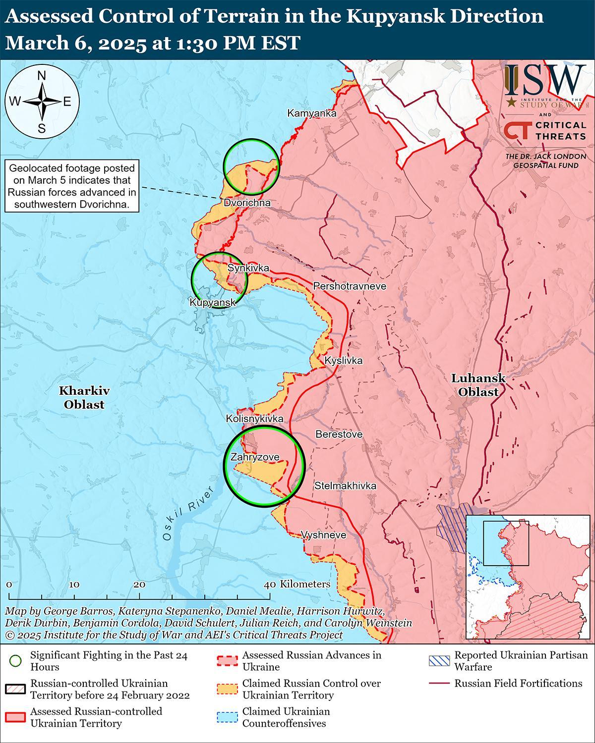 Группировка войск «Хортица» сообщила 6 марта, что российские войска пытаются создать новый плацдарм на правом берегу реки Оскол в районе Красного Первого и что российские войска пытались расширить ранее существовавший плацдарм в районе Калиново (к югу от Двуречной) и пытаются перебросить дополнительные подразделения на западный берег реки Оскол, пока погодные условия остаются удовлетворительными. [52] Заместитель командира полка, действующего на Купянском направлении, 6 марта сообщил, что потепление приводит к таянию льда на реке Оскол, что еще больше затруднит попытки российских войск форсировать реку. [53] Заместитель командира отметил, что российские войска не перебрасывают через реку технику, но российская пехота продолжает форсировать реку, в том числе в районе Двуречной. [54] Украинский заместитель командира сообщил, что до 500 российских военнослужащих переправились через реку к северу от Купянска, но российские войска не смогли укрепить свои позиции на правом берегу. Российский военный блогер заявил, что российские войска используют превосходство артиллерии и беспилотников, а также преимущество в живой силе на Купянском направлении для продвижения в этом районе. [55]