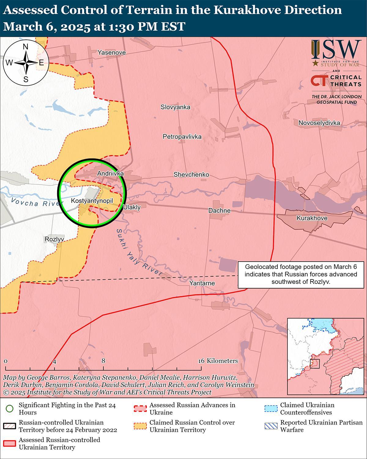 Оценка российского продвижения: геолоцированные кадры, опубликованные 6 марта, указывают на то, что российские войска недавно продвинулись к юго-западу от Розлива (к юго-западу от Курахово). [78]
