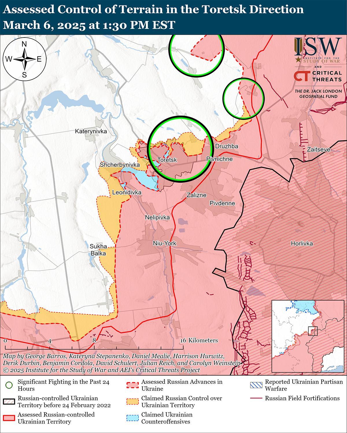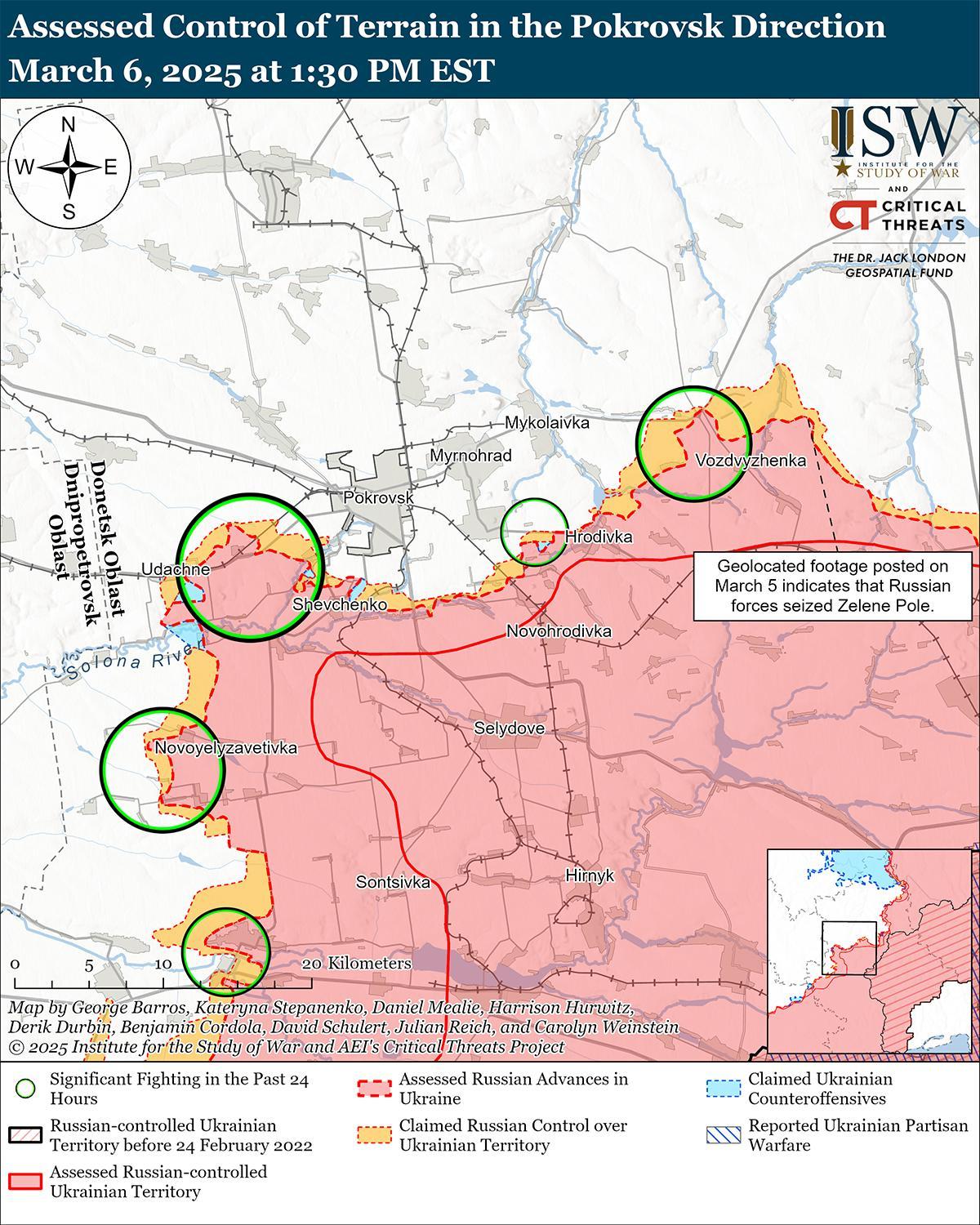 Оценка российского продвижения: геолоцированные кадры, опубликованные 5 марта, указывают на то, что российские войска захватили Зеленое Поле (к востоку от Покровска). [71]