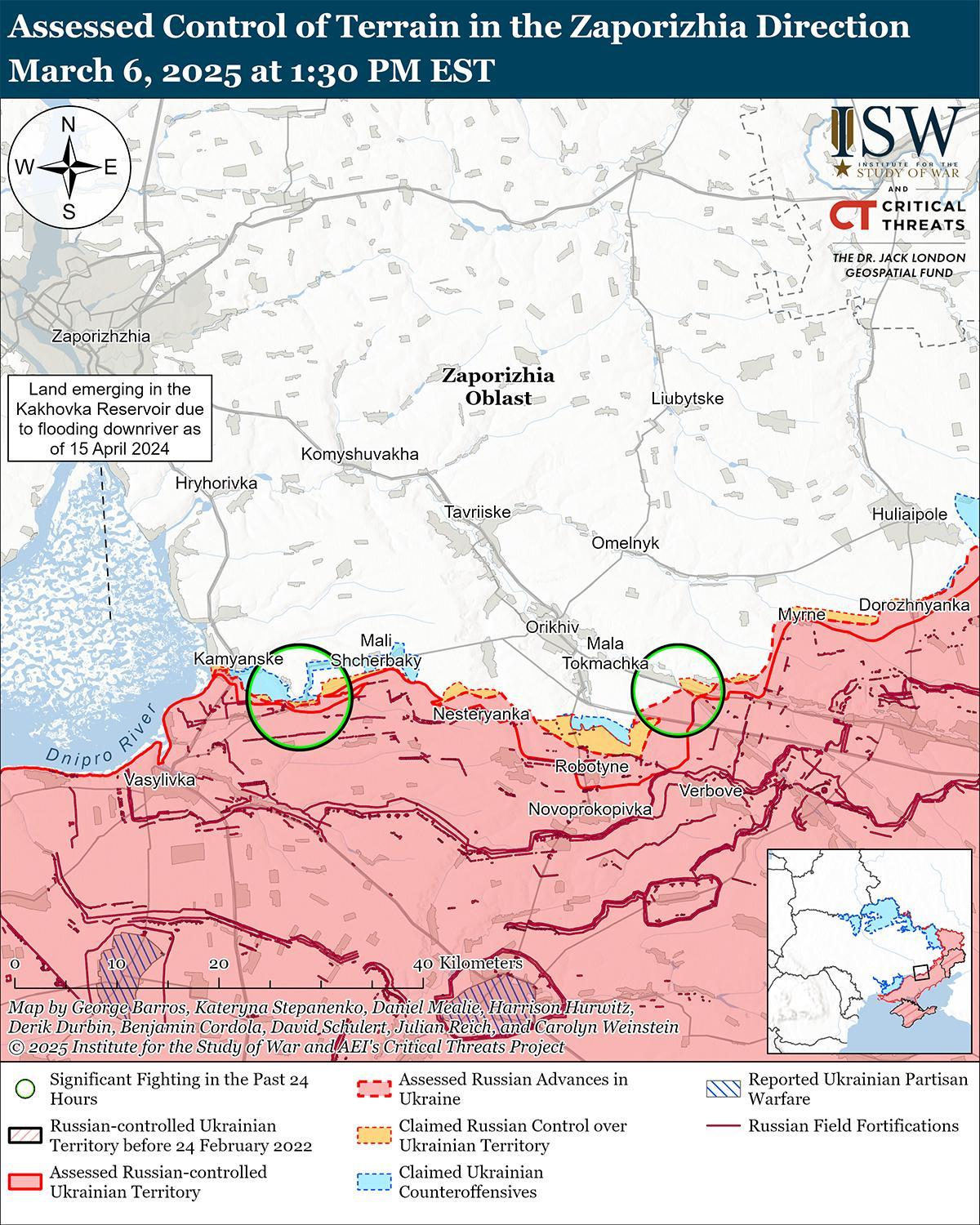 Европейские страны продолжают заявлять о новых пакетах военной помощи и других мерах поддержки украинских военных. Министр обороны Франции Себастьен Лекорню 6 марта заявил, что Франция продолжит предоставлять разведданные Украине после того, как 5 марта США приостановили обмен разведданными с Украиной. [28] Лекорню заявил, что президент Франции Эммануэль Макрон поручил французскому правительству ускорить различные пакеты военной помощи, чтобы компенсировать недостаток военной помощи США Украине. [29] Президент Украины Владимир Зеленский встретился с Макроном 6 марта и обсудил необходимость дополнительных и более существенных шагов для прекращения войны в Украине и защиты всей Европы. [30] Премьер-министр Нидерландов Дик Шоф объявил 6 марта, что Нидерланды зарезервируют для Украины фонд в размере 3,5 миллиарда евро (3,8 миллиарда долларов) в 2026 году, в том числе 700 миллионов евро (755 миллионов долларов) для инвестиций в украинские беспилотники, и что Нидерланды могут использовать эти средства в 2025 году в случае необходимости. [31] Министерство обороны Великобритании (МО) объявило о новом контракте на сумму 30 миллионов фунтов стерлингов (38,6 миллиона долларов) с американо-британской оборонной технологической компанией Anduril UK на поставку Украине ударных беспилотников Altius 600m и Altius 700m. [32]