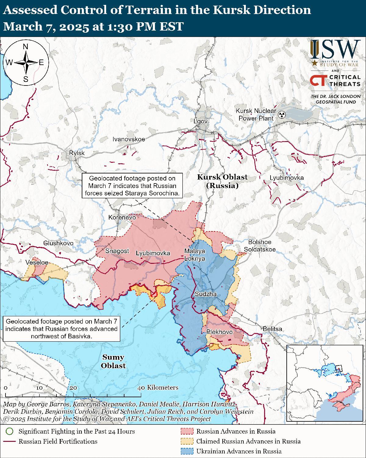 Оценка российского наступления: геолоцированные кадры, опубликованные 7 марта, указывают на то, что российские войска, в том числе, как сообщается, подразделения 22-го мотострелкового полка (72-я мотострелковая дивизия, 44-й армейский корпус, Ленинградский военный округ), захватили Старую Сорочину (к северо-западу от Суджи). [32] На геолоцированных кадрах, опубликованных 7 марта, видно, что российские войска продвинулись к юго-востоку от Николаево-Дарьино (к северо-западу от Суджи). [33]