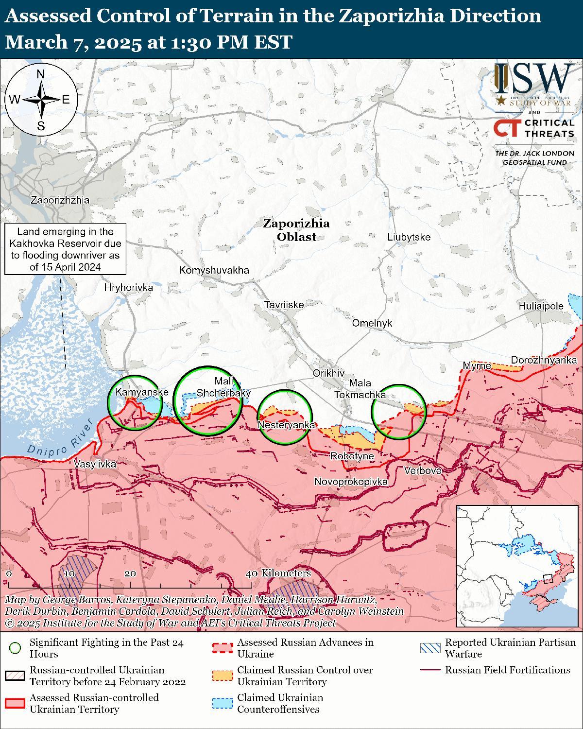 Заместитель председателя Совета безопасности России Дмитрий Медведев заявил 5 марта, что поставки американского оружия Украине «скорее всего, возобновятся», но что «главной задачей» России остается «нанесение максимального ущерба» Украине «на земле» в течение этого ограниченного окна. [11] Российские войска, по-видимому, еще больше активизируют наступательные операции против украинских войск в Курской области и на направлении Часов Яр и, вероятно, намерены использовать краткосрочные последствия прекращения американской помощи, особенно обмена разведданными, для достижения российских оперативных целей в этих районах.