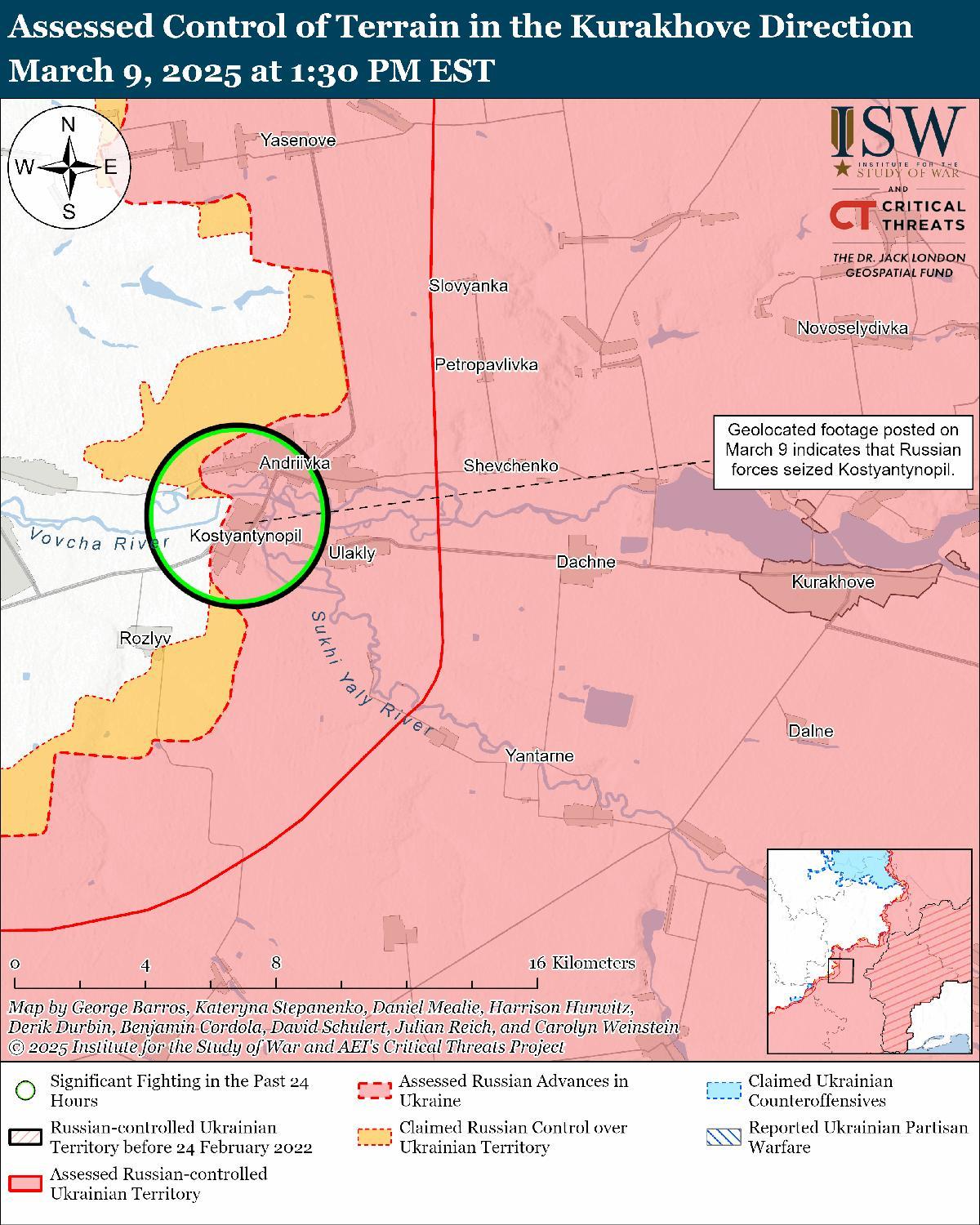 Оценка российского продвижения: на геолоцированных кадрах, опубликованных 9 марта, видно, как российские военнослужащие поднимают российские флаги в центральном и юго-западном Константинополе (к западу от Курахово), что указывает на то, что российские войска недавно захватили населенный пункт. [70] 9 марта Министерство обороны России заявило, что российские войска захватили Константинополь. [71]