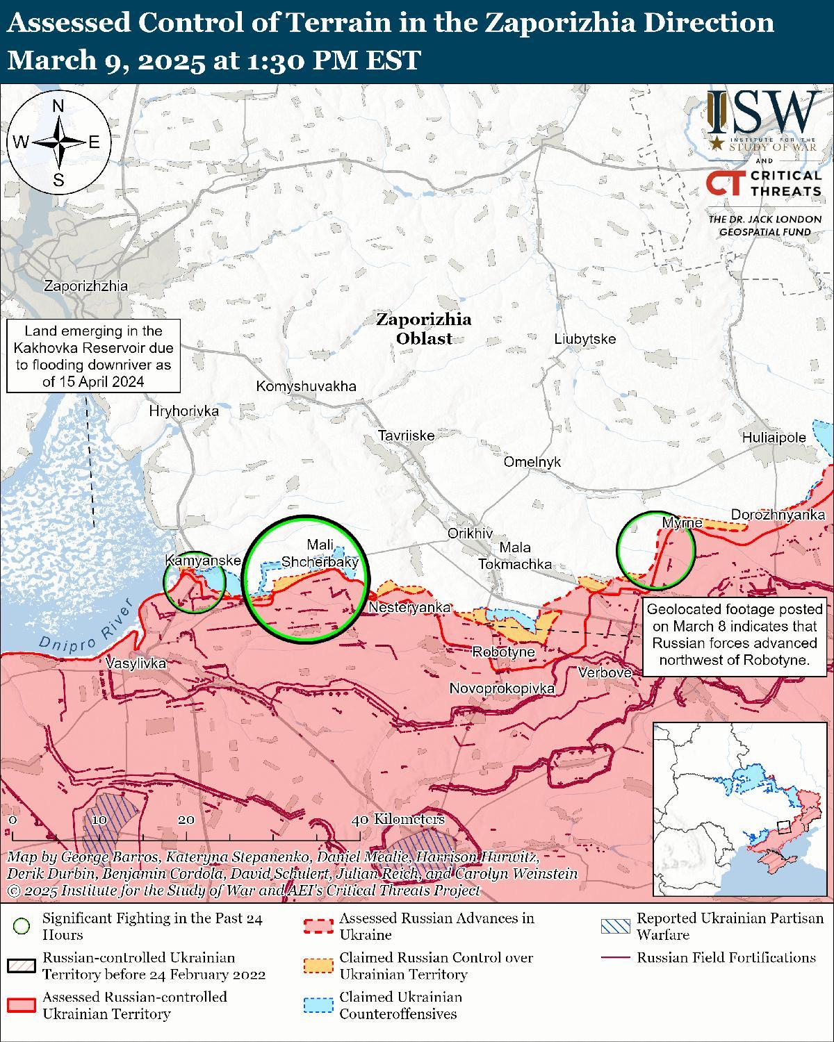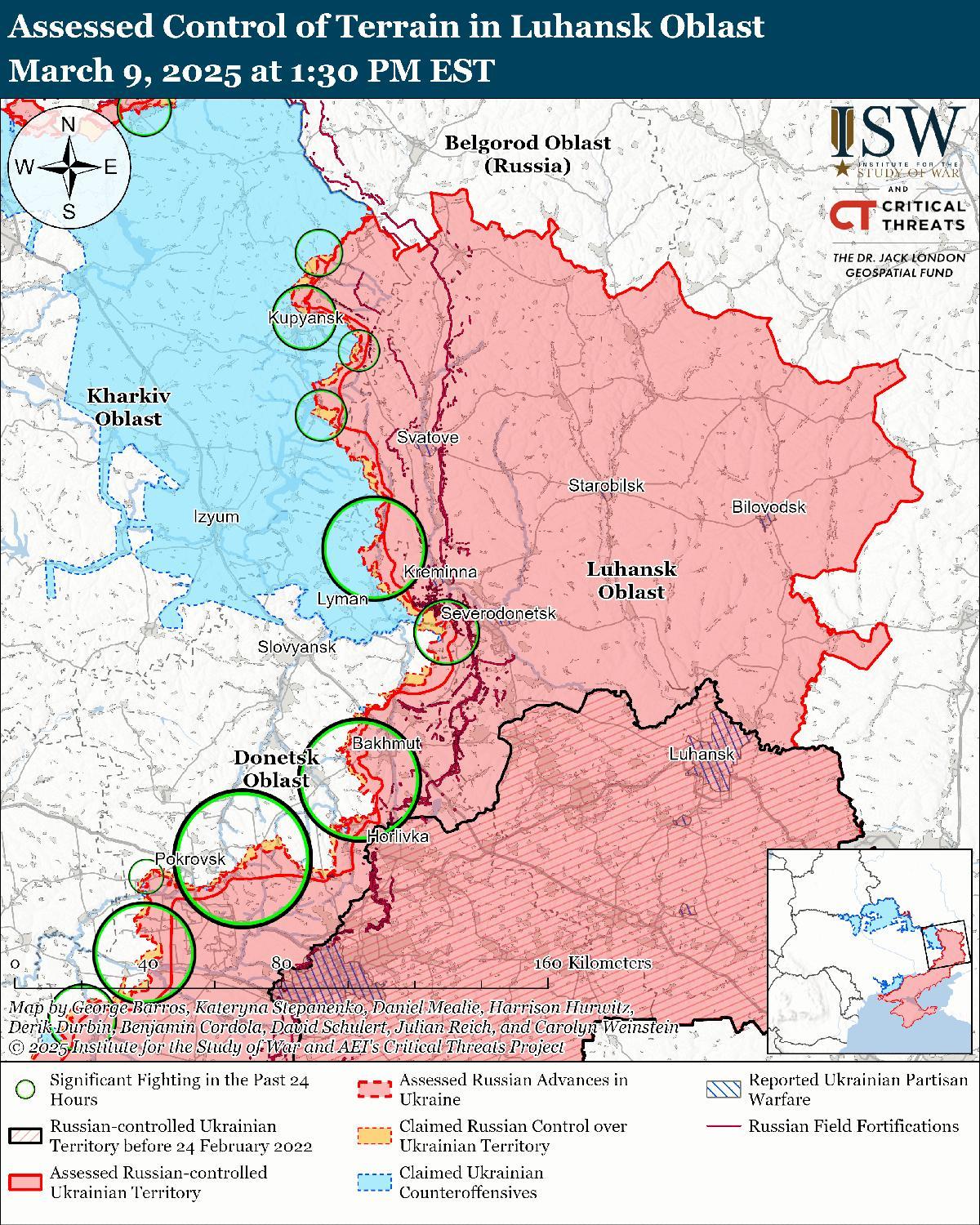 Российские войска разрушают северную часть Украинского выступа в Курской области после нескольких дней интенсивной российской деятельности в этом районе. На геолоцированных кадрах, опубликованных 8 марта, видно, что российские войска захватили Новую Сорочину (к северо-западу от Суджи), Малую Локню (к югу от Новой Сорочины) и Лебедевку (к югу от Малой Локни), а также поля между населенными пунктами. [1] Российские военные блогеры утверждали, что подразделения российской 34-й мотострелковой бригады (49-я общевойсковая армия [ОА], Южный военный округ [ЮВО]) захватили Малую Локню, а подразделения российского 51-го воздушно-десантного полка (106-я дивизия ВДВ) захватили Лебедевку. [2] Российские военные блогеры утверждали, что российские войска захватили Правду и Ивашковский (оба к северу от Суджи) и позиции вдоль неуказанного участка железнодорожной линии между Малой Локней и Суджей. [3] Российские военблогеры утверждают, что украинские войска занимают ограниченные позиции в Малой Локне, Черкасском Поречном (к северу от Суджи) и Мартыновке (к северо-востоку от Суджи), но что большинство украинских сил отошли с позиций в северной части выступа в направлении Казачьей Локни и Суджи.[5] Российские военблогеры утверждают, что подготовительные усилия России по уничтожению мостов к северу и югу от Суджи значительно осложнили возможность Украины отступить обратно в Суджу.[6] Российский военблогер заявил, что украинские силы безуспешно контратаковали в районе Малой Локни.[7]