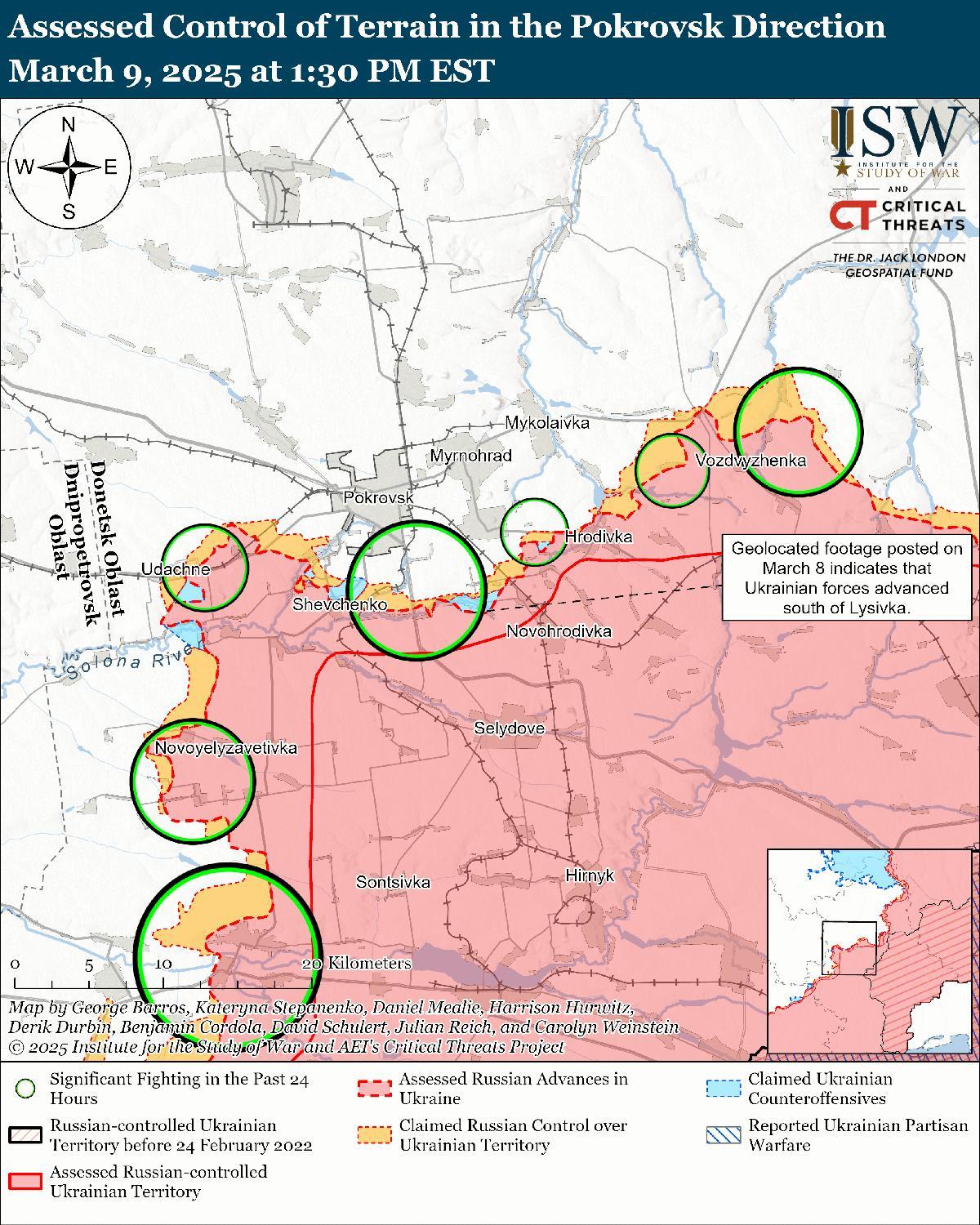 Оценка украинского продвижения: геолоцированные кадры, опубликованные 8 марта, указывают на то, что украинские войска в последнее время продвинулись вдоль улицы Половой на юго-востоке Лысовки (к юго-востоку от Покровска) и к югу от населенного пункта. [61]