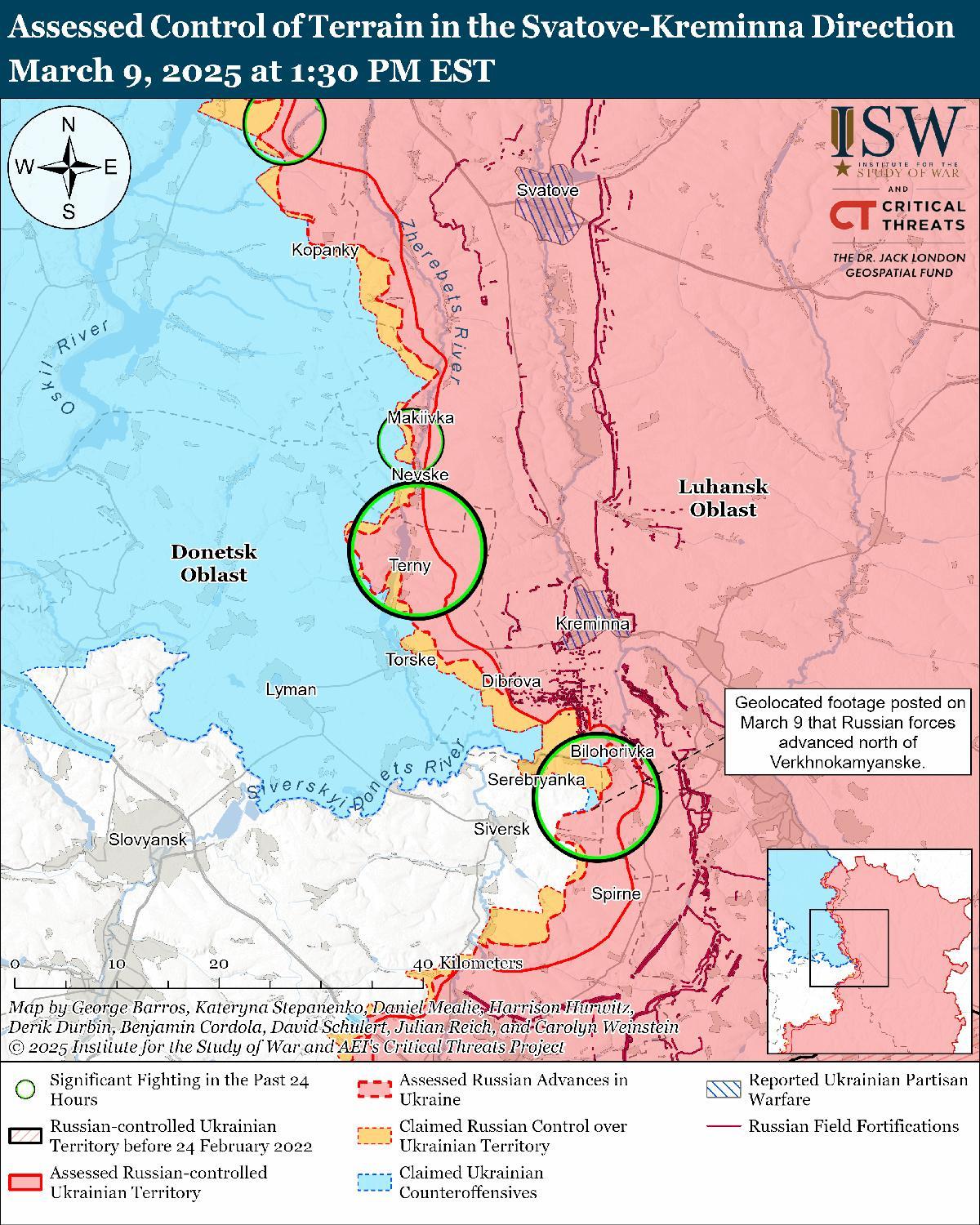 Российские войска атаковали к северу от Лимана в направлениях Нового и Зеленой Долины и к северо-востоку от Лимана в районах населенных пунктов Мирное, Ямполовка, Журавка (бывшее Невское), Ивановка и Колодязи, а также в направлении Новомихайловки; и к востоку от Лимана под Торским 8 и 9 марта. [49]