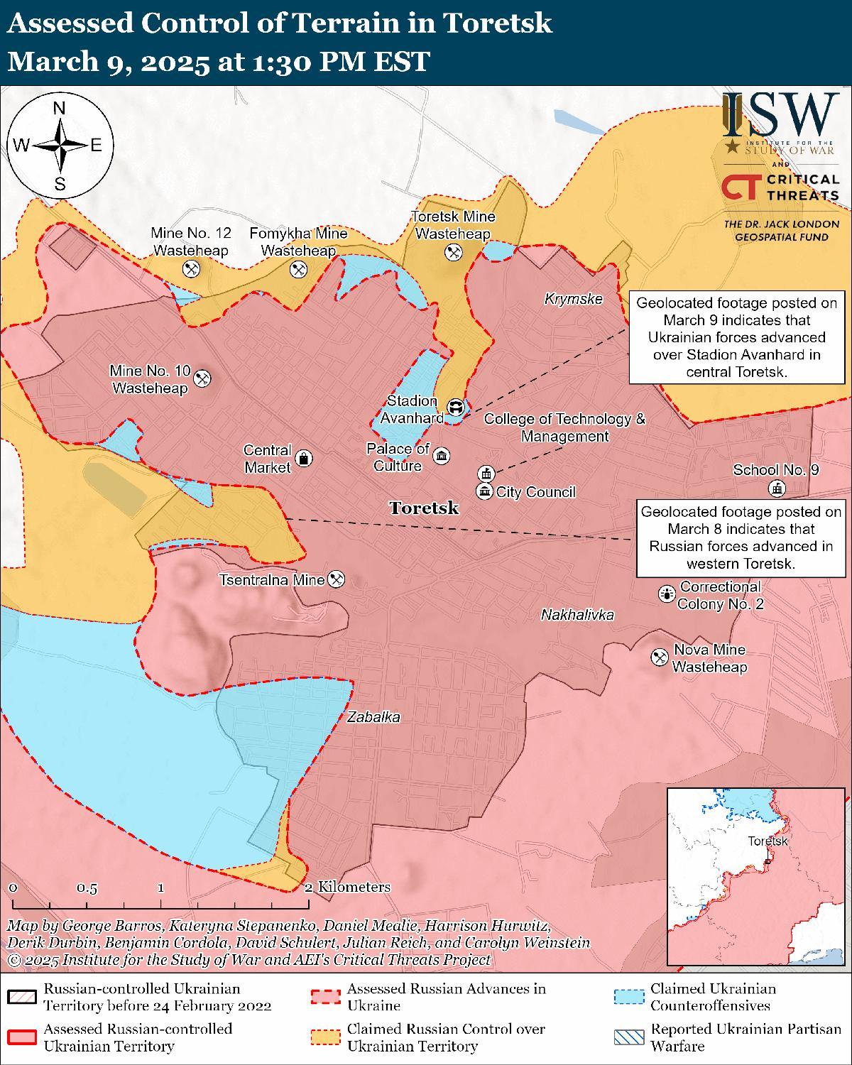 Оценка украинского продвижения: геолоцированные кадры, опубликованные 9 марта, указывают на то, что украинские войска недавно незначительно продвинулись в центре Торецка и отбили стадион «Авангард» в центре Торецка. [55]
