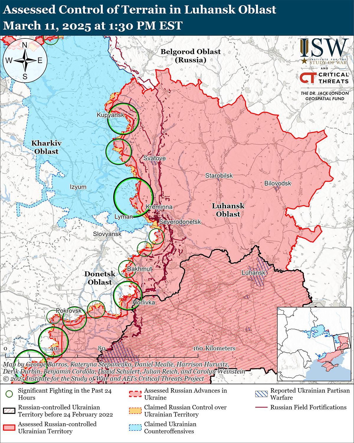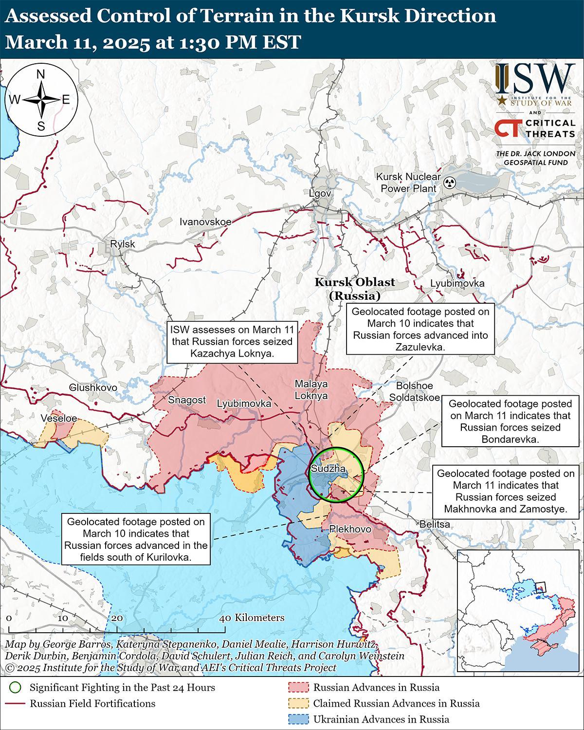 Российские войска продолжают успешно продвигаться в Курской области и, вероятно, начали наступление на Суджу. Геолоцированные кадры, опубликованные 11 марта, свидетельствуют о том, что российские войска недавно захватили Бондаревку (к востоку от Суджи), Замостье и Махновку (оба к юго-востоку от Суджи). [19] Дополнительные геолоцированные кадры, опубликованные 10 и 11 марта, указывают на то, что российские войска недавно продвинулись в центральную часть Зазулевки (к северу от Суджи), на юго-восточных окраинах Колмакова (к юго-востоку от Суджи) и к югу от Куриловки (к югу от Суджи). [20] Российские военные блогеры заявили 11 марта, что российские войска захватили Казачью Локню (к северу от Суджи), а недавние успехи российских войск к северу от Казачьей Локни и к востоку от Суджи, вероятно, вынудили украинские войска отступить из Казачьей Локни и Княжьего 2 (к северу от Суджи и непосредственно к югу от Казачьей Локни). [21] Российские военные блогеры утверждали, что российские войска захватили Колмаков и Дмитрюков (оба к юго-востоку от Суджи) и продвинулись к востоку от Свердликово вдоль трассы 38К-030 Коронево-Суджа. [22] Российские военные блогеры утверждали, что подразделения 22-го мотострелкового полка (72-я мотострелковая дивизия, 44-й армейский корпус, Ленинградский военный округ) и 155-й бригады морской пехоты (Тихоокеанский флот) захватили Княжий 1 (севернее Суджи). [23] Российские военные блогеры утверждали, что российские войска продвинулись к окраинам Заолошенки (к северу от Суджи) и что подразделения российской 11-й воздушно-десантной бригады (ВДВ) продвигаются в саму Суджу из Мирного (к востоку от Суджи). [24] Российские войска продолжали наступление на территории самой Суджи; севернее Суджи в районе Казачьей Локни, Южного, Кубаткино и Ивашковского; и вблизи международной границы в Сумской области в районе Журавки. [25] Сообщается, что подразделения российского штурмового отряда «Ветераны» (Добровольческий корпус России) действуют к востоку от Суджи в районе Мирного. [26]