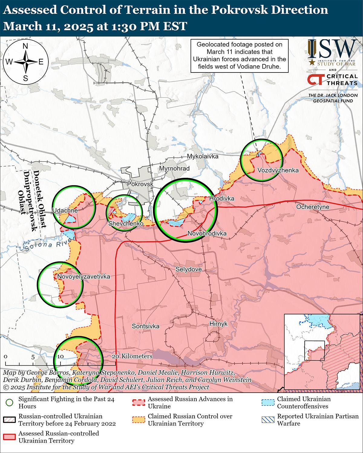 Оценка украинского продвижения: геолоцированные кадры, опубликованные 11 марта, указывают на то, что украинские войска недавно продвинулись к западу от Водяного Второго (к северо-востоку от Покровска). [57]