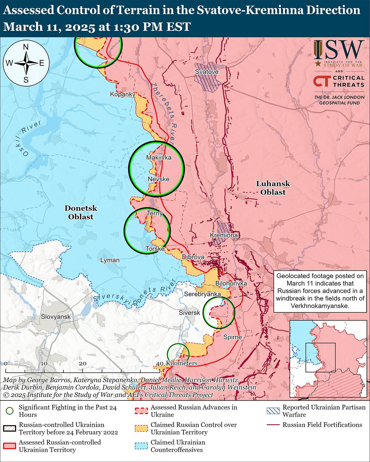 Оценка российского продвижения: геолоцированные кадры, опубликованные 11 марта, на которых российские войска ведут механизированное наступление численностью примерно до батальона, указывают на то, что российские войска недавно продвинулись к северу от Верхнекаменского (к востоку от Северска). [45] Луганская группировка войск сообщила, что в ходе российской атаки украинские войска уничтожили 14 единиц бронетехники и один танк, а также повредили 16 единиц бронетехники и два танка. [46]