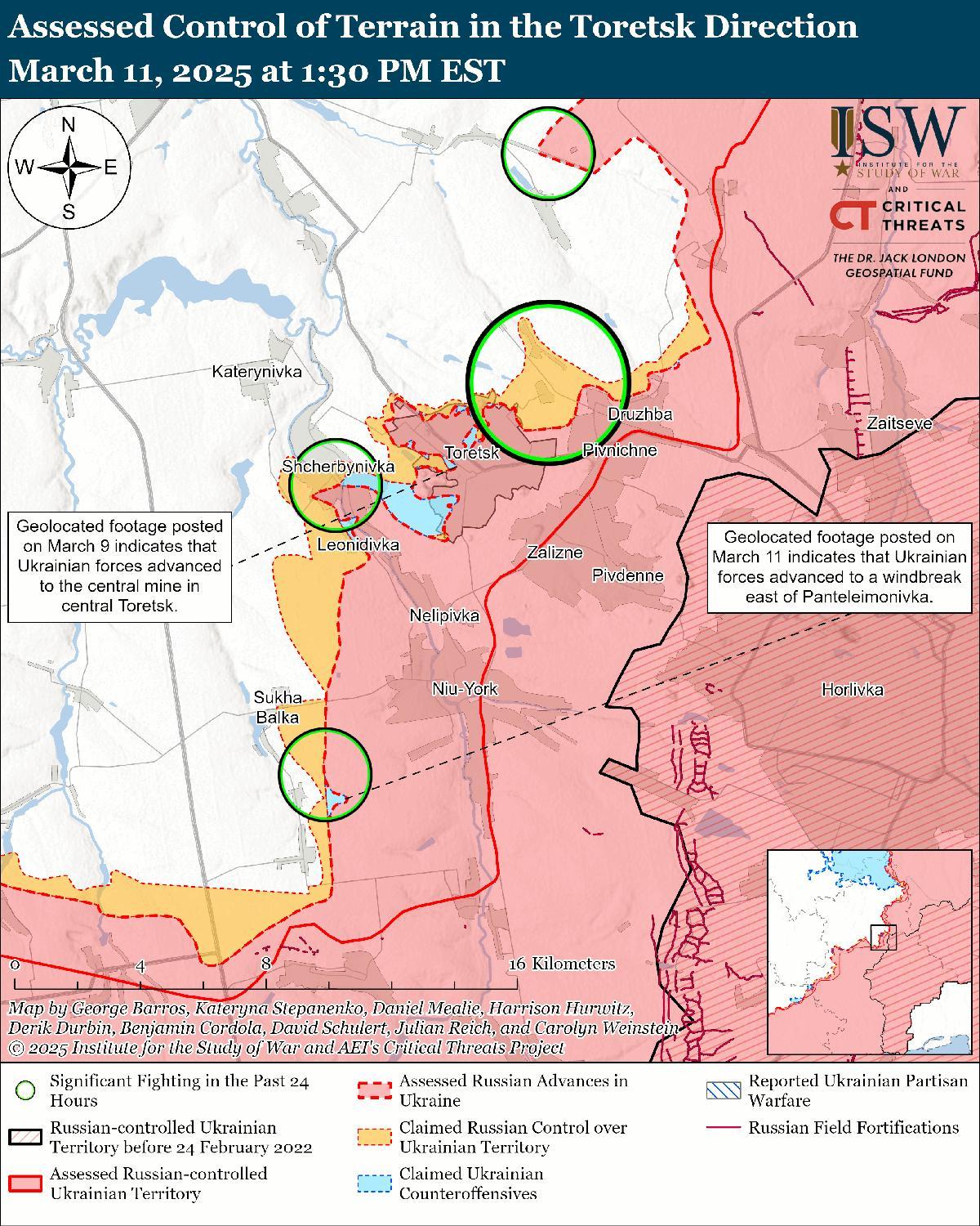 Оценка украинского продвижения: геолоцированные кадры, опубликованные 6 и 9 марта, указывают на то, что украинские войска недавно продвинулись к востоку от Пантелеймоновки (к юго-западу от Торецка) и к шахте «Центральная» в центре Торецка. [51]