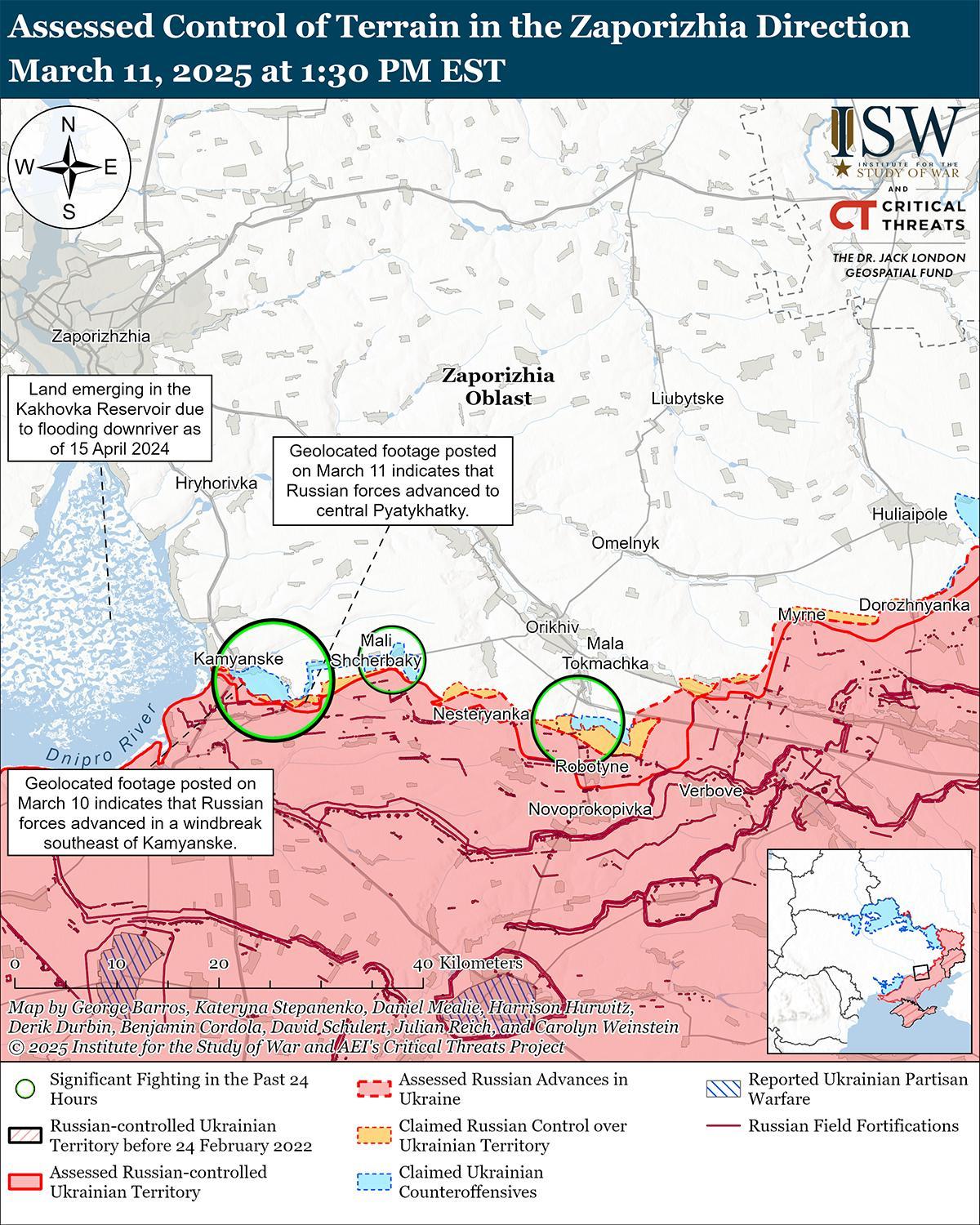 Оценка российского продвижения: геолоцированные кадры, опубликованные 11 марта, на которых российский военнослужащий поднимает российский флаг в центре Пятихаток (к северо-западу от Работино), указывают на то, что российские войска недавно продвинулись в этом районе. [67] На геолоцированных кадрах, опубликованных 10 марта, указано, что в последнее время российские войска продвинулись к юго-востоку от Каменского (к северо-западу от Работино). [68]
