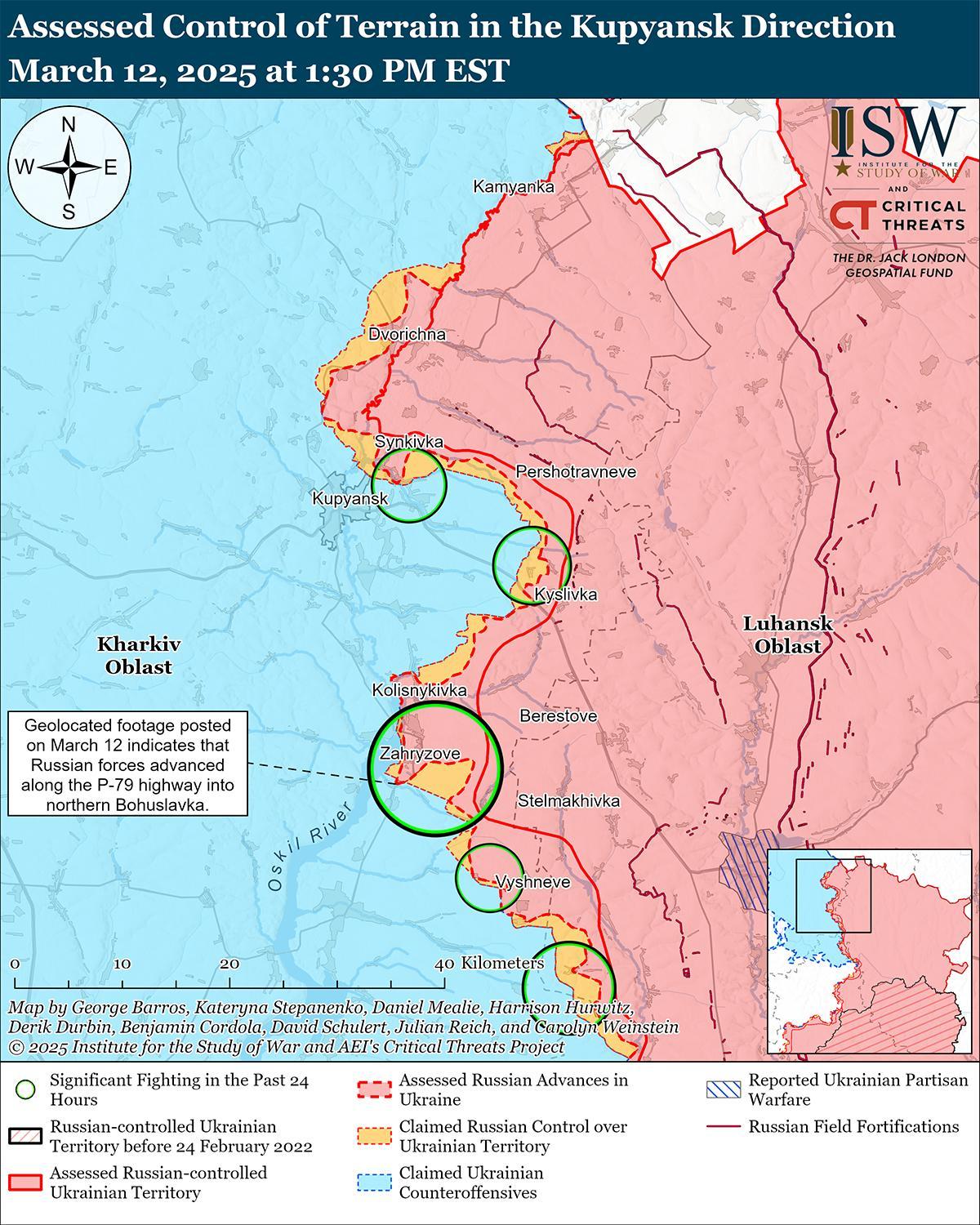 Оценка российского продвижения: геолоцированные кадры, опубликованные 12 марта, указывают на то, что российские войска недавно продвинулись в северную часть Богуславки (к северо-востоку от Боровой) и, вероятно, захватили Загрызово (непосредственно к северо-востоку от Богуславки). [39][40]