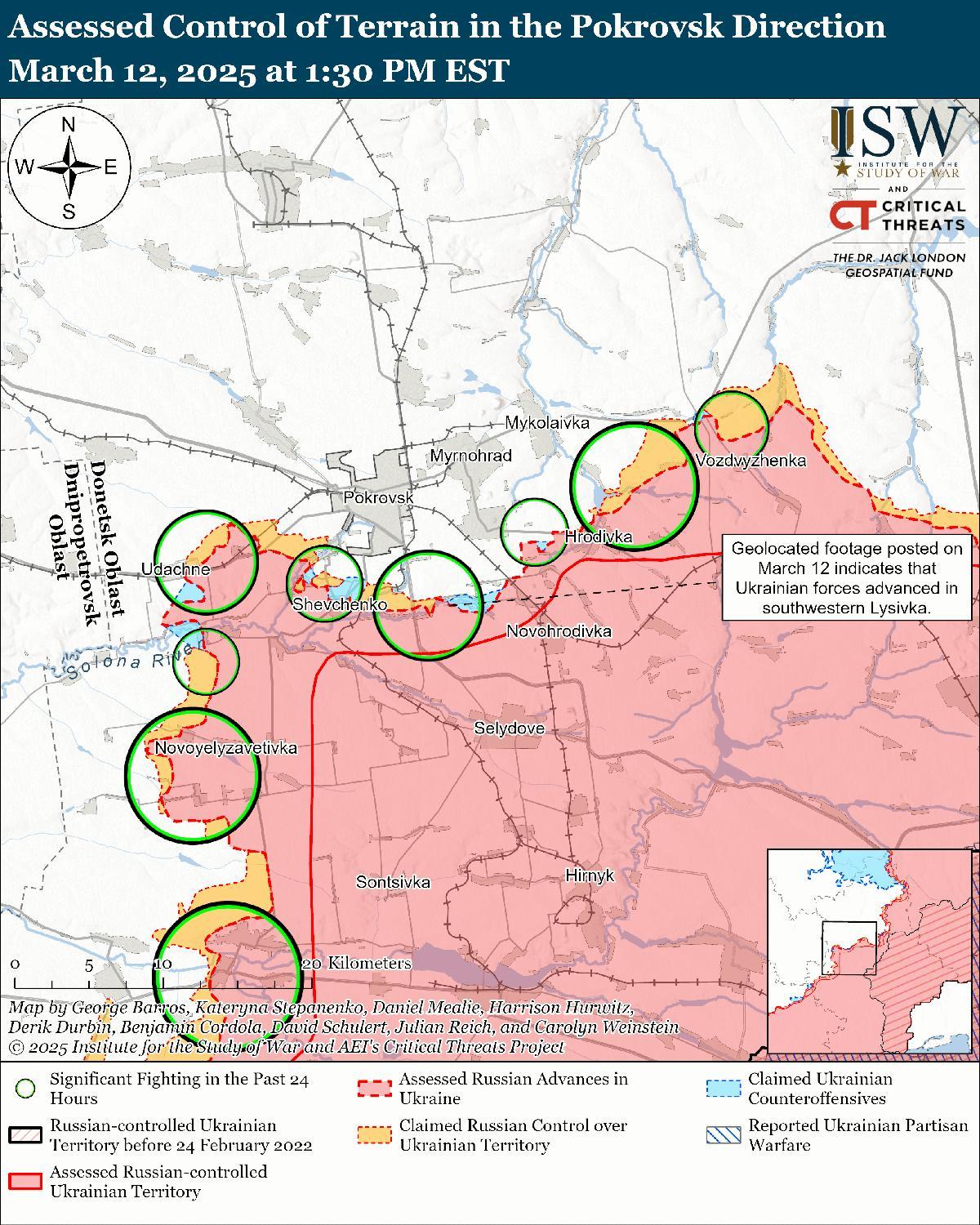 Российские войска атаковали под самим Покровском; северо-восточнее Покровска в районе Тарасовки и Водяного Второго; восточнее Покровска в районе Елизаветовки и Проминя; к юго-востоку от Покровска в районе Лысовки, Даченского, Новотроицкого и Николаевки; южнее Покровска под Шевченко, Видроження (бывший Новый Труд), Новоукраинка и Зеленое; юго-западнее Покровска в районе Песчаного, Зверево, Леонтовичей (бывшее Первое Мая), Удачного, Котлино, Надиевки, Преображенки, Новоалександровки, Богдановки, Котляровки; и западнее Покровска в направлении Сергеевки 11 и 12 марта. [63]