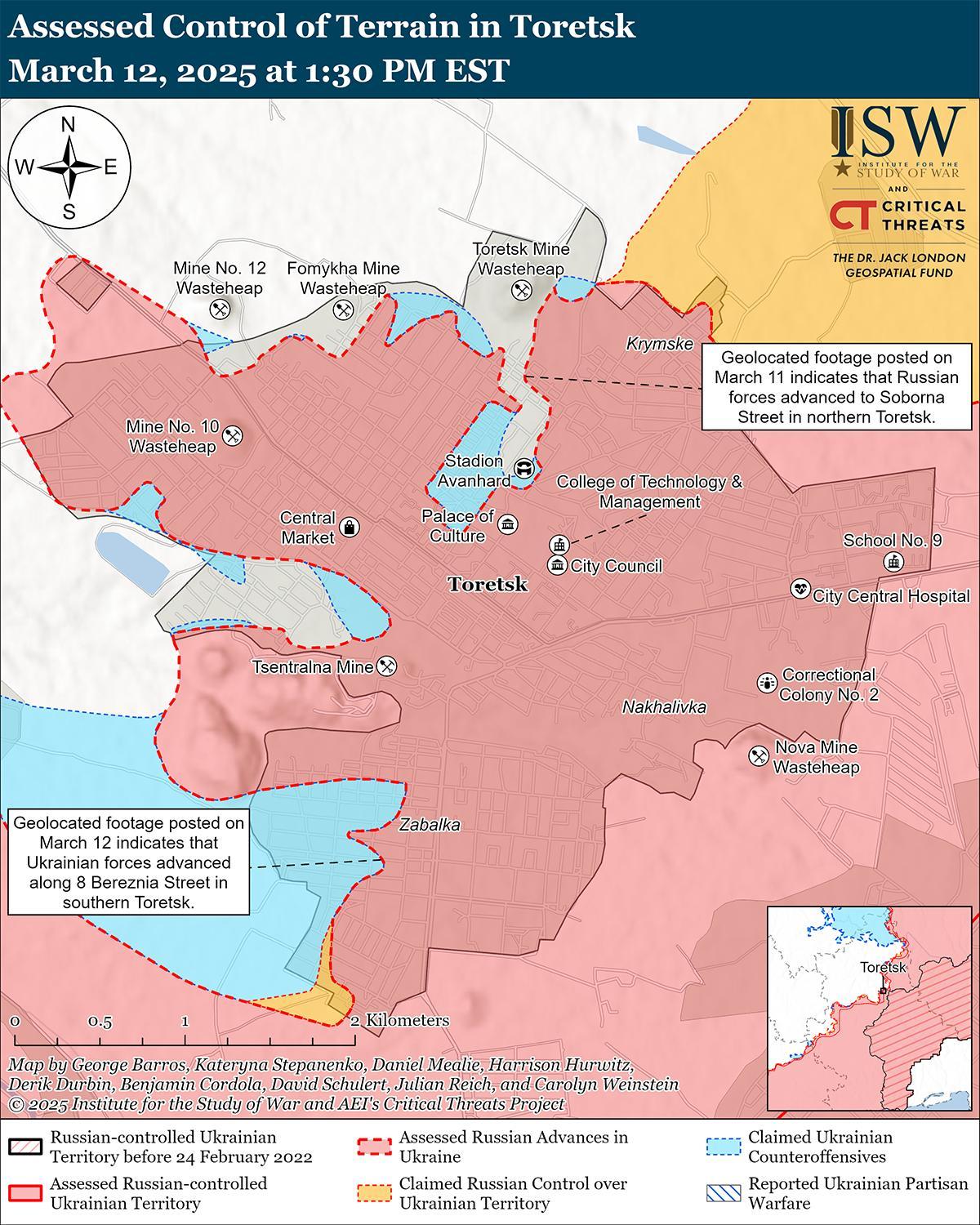 Оценка украинского продвижения: геолоцированные кадры, опубликованные 12 марта, указывают на то, что украинские войска недавно продвинулись вдоль улицы 8-го марта на юге Торецка. [52]