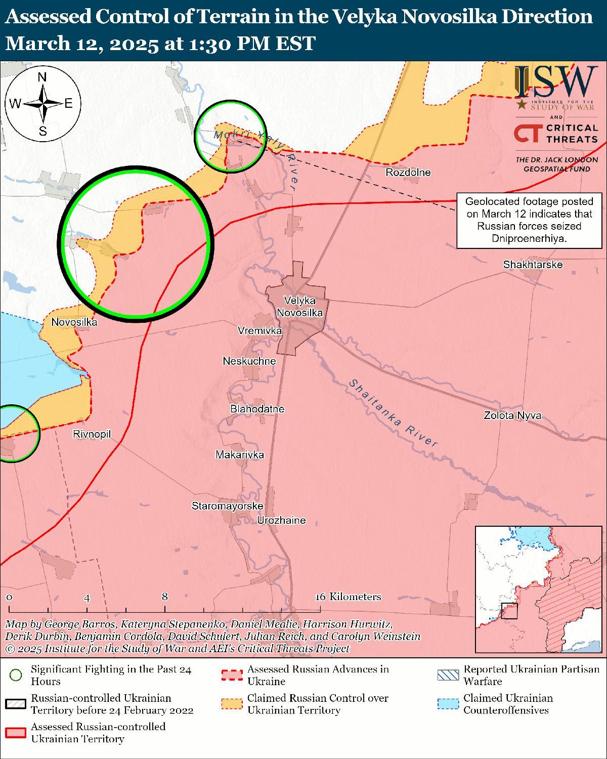 Оценка российского продвижения: геолоцированные кадры, опубликованные 12 марта, указывают на то, что российские войска недавно захватили Днепроэнергию (к северу от Великой Новоселки). [69] Минобороны РФ и другие российские источники утверждали, что в захвате населенного пункта участвовали подразделения 37-й мотострелковой бригады (36-я ОА, Восточный военный округ) и 40-й бригады морской пехоты (Тихоокеанский флот). [70]