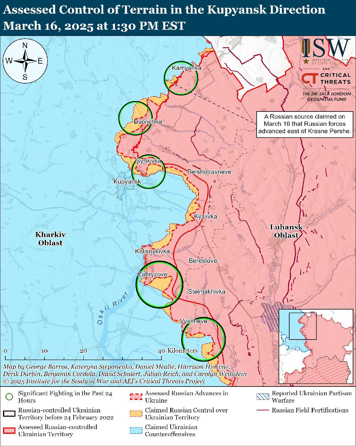 Российские войска атаковали в направлении самого Купянска; севернее Купянска в районе Кутковки; к северо-востоку от Купянска в районе Каменки и Петровки; и восточнее Купянска в районе Петропавловки 15 и 16 марта. [34]