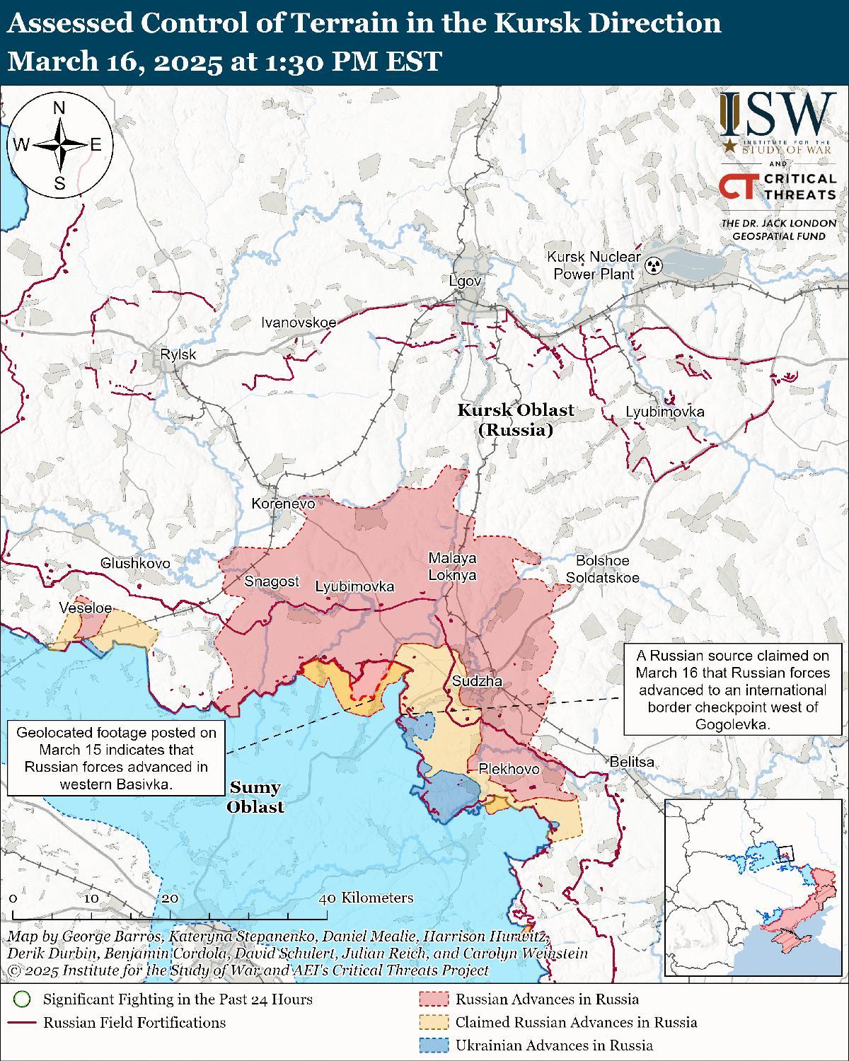 16 марта российские источники усилили необоснованные заявления о систематических нарушениях со стороны Украины и убийстве мирных жителей при отступлении из Курской области. [30] 15 марта ISW предупредил, что Кремль, вероятно, готовится активизировать нарратив, обвиняющий украинские силы в военных преступлениях в Курской области в попытке дискредитировать украинскую армию, подорвать западную поддержку Украины и испортить или отсрочить прямые обсуждения предложения о 30-дневном прекращении огня между США и Украиной. [31]