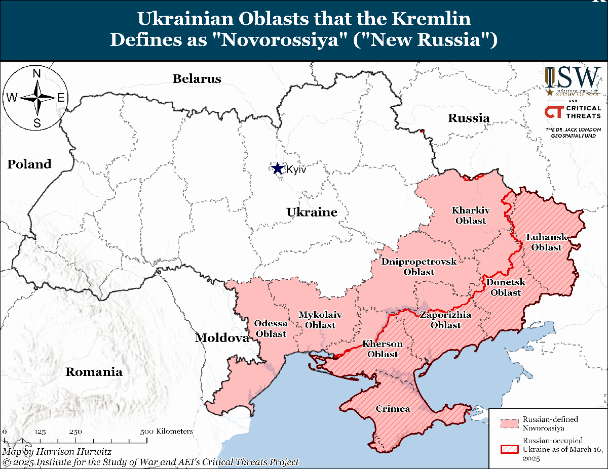 Однако российские официальные лица сохраняют максималистские территориальные претензии на всю оккупированную Украину и значительную часть неоккупированной Украины. Высокопоставленные кремлевские чиновники, в том числе президент России Владимир Путин, последовательно требовали от Украины сдать всю Донецкую, Луганскую, Запорожскую и Херсонскую области, включая районы, которые российские войска еще не оккупировали, и повторяли эти заявления в последние недели. [6] Российские государственные СМИ также недавно усилили аналогичные настроения со стороны связанных с Кремлем рупоров. [7] Недавно Путин заявил, что «Новороссия» является неотъемлемой частью России, а пресс-секретарь Кремля Дмитрий Песков определил «Новороссию» как всю восточную и южную Украину, включая Харьковскую, Днепропетровскую, Одесскую и Николаевскую области. [8] В настоящее время Россия оккупирует небольшую часть Харьковской области и Кинбурнскую косу в Николаевской области, а российские войска продвигаются к административной границе Днепропетровской области. Продолжающиеся заявления Кремля с требованием к Украине уступить неоккупированную украинскую территорию указывают на то, что Кремль и Путин остаются приверженными этим территориальным целям, несмотря на продолжающиеся переговоры.