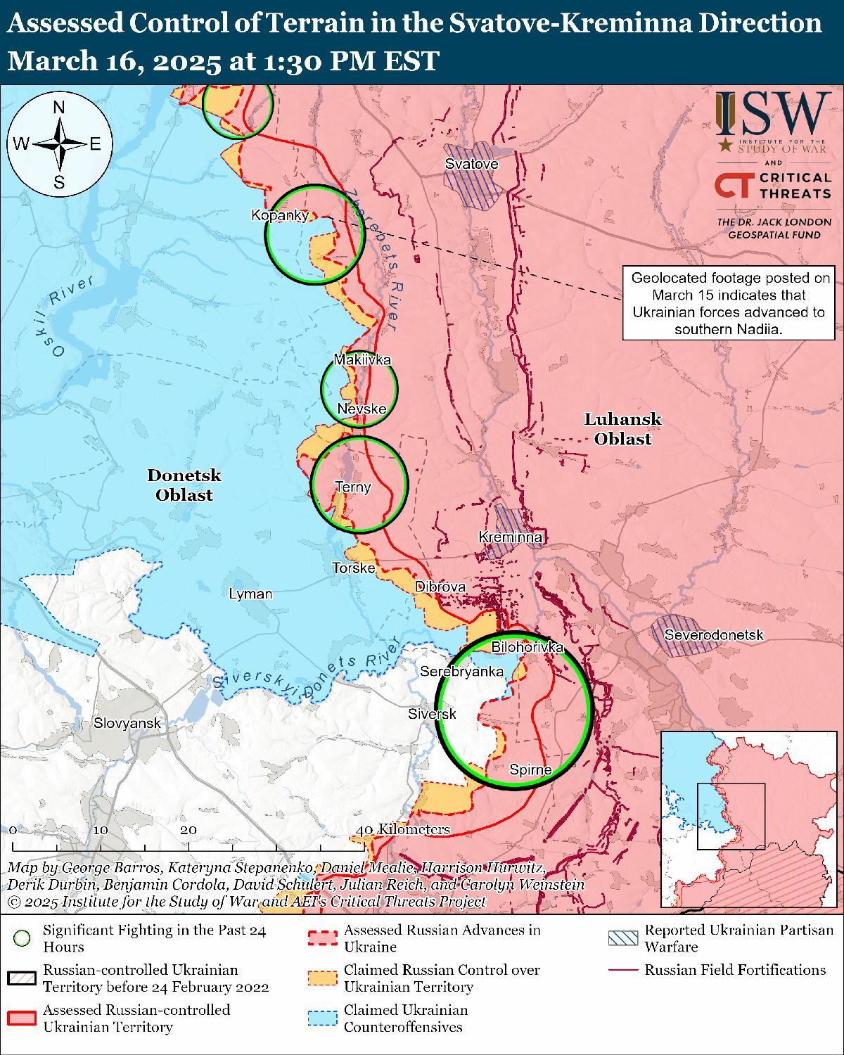 Оценка украинского продвижения: геолоцированные кадры, опубликованные 15 марта, указывают на то, что украинские войска недавно продвинулись в южной части Надежды (к востоку от Боровой). [37]