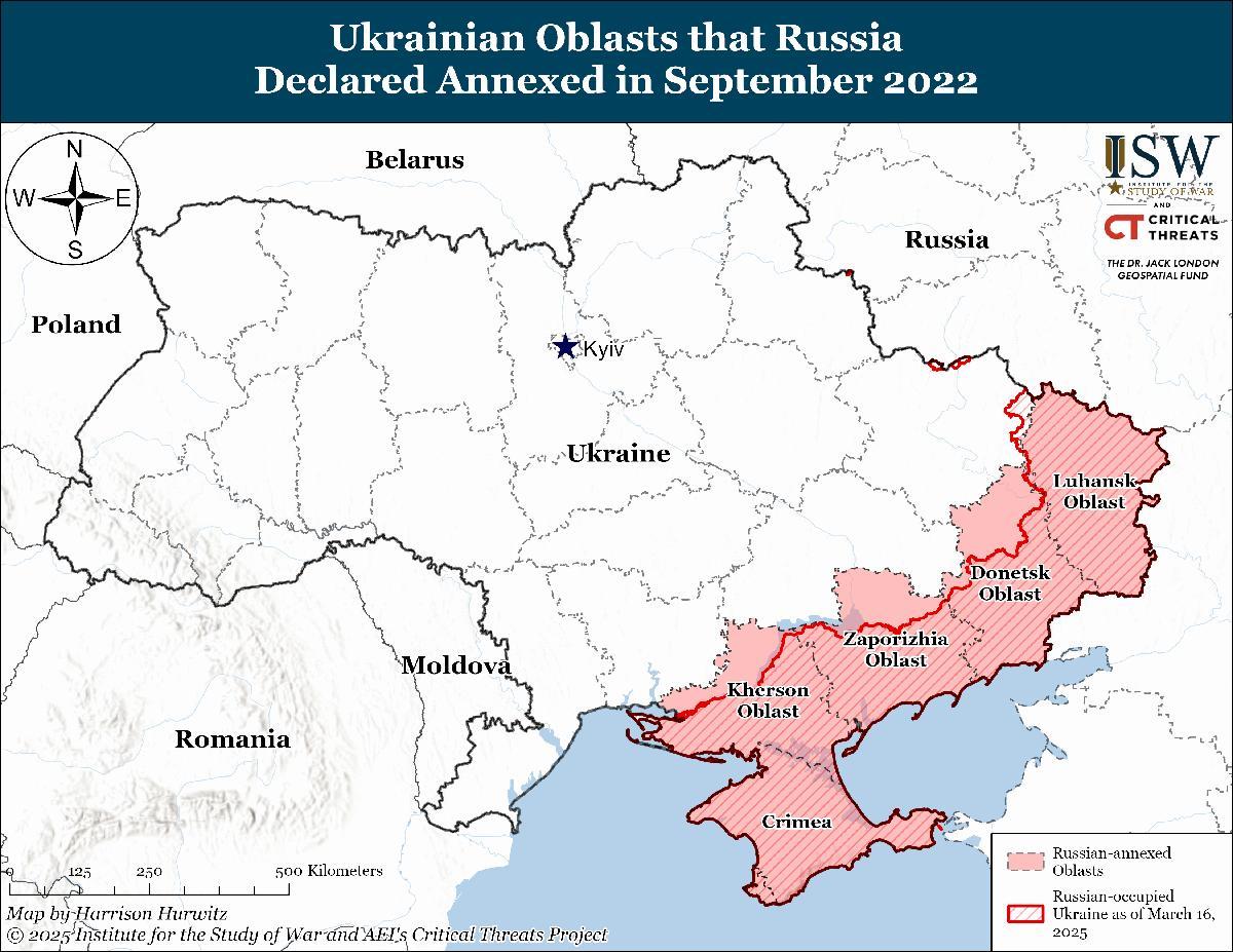 - Однако российские официальные лица сохраняют максималистские территориальные претензии на всю оккупированную Украину и значительную часть неоккупированной Украины.