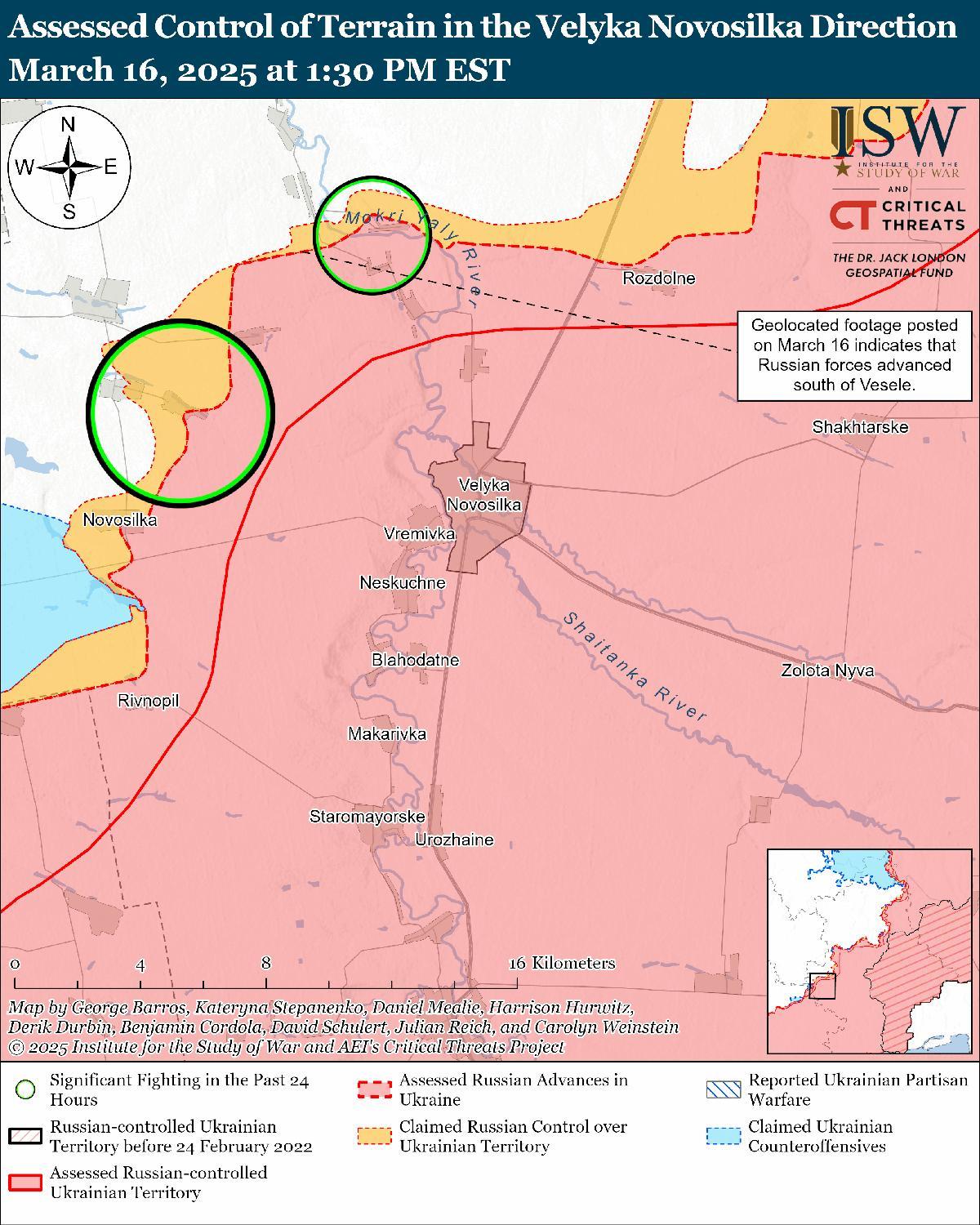 Оценка российского продвижения: геолоцированные кадры, опубликованные 16 марта, указывают на то, что российские войска продвинулись в полях к югу от Веселого (к северу от Великой Новоселки). [61]