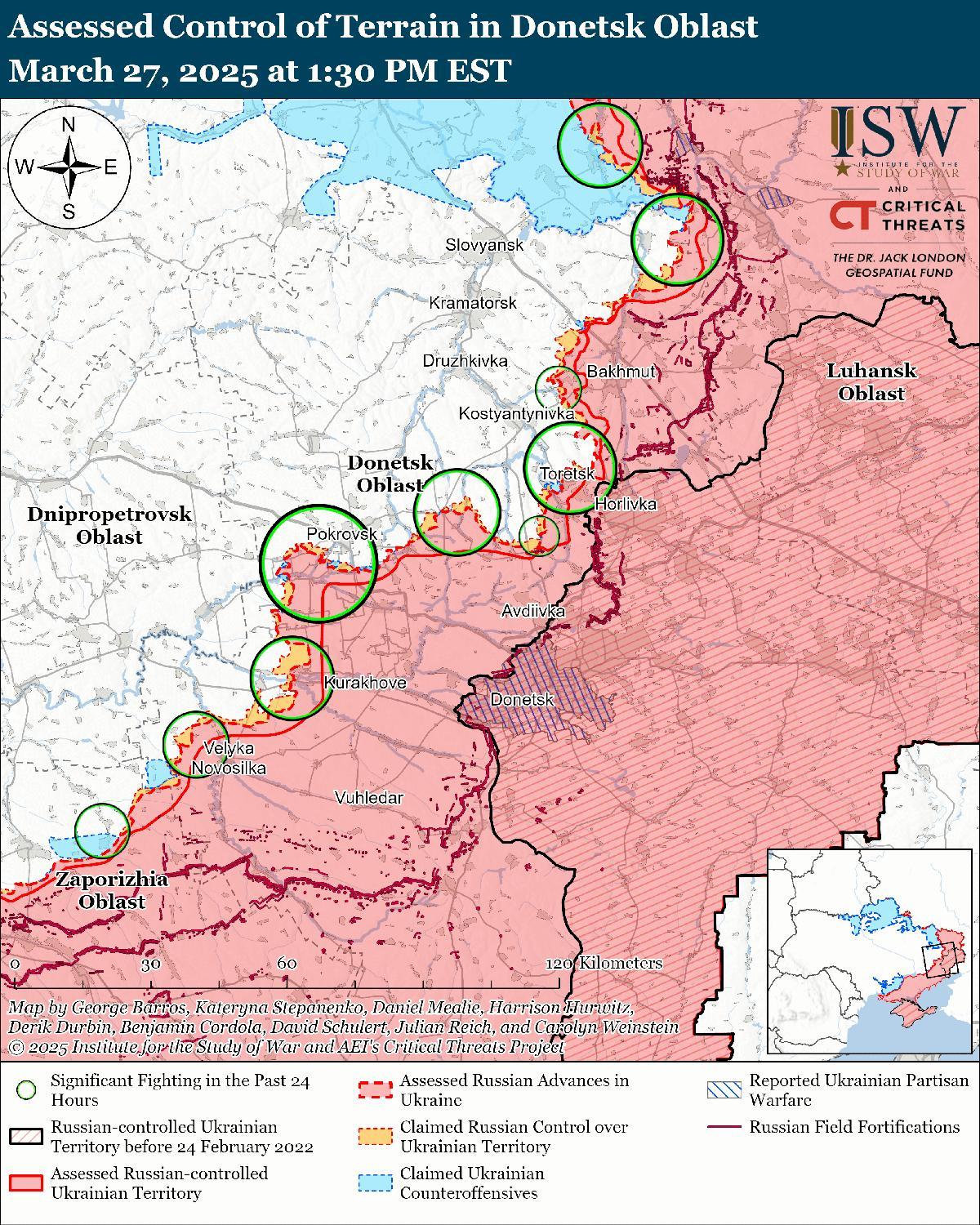 Оценка украинского продвижения: геолоцированные кадры, опубликованные 27 марта, указывают на то, что украинские войска в последнее время незначительно продвинулись к северо-западу от Котлино (к юго-западу от Покровска). [64]