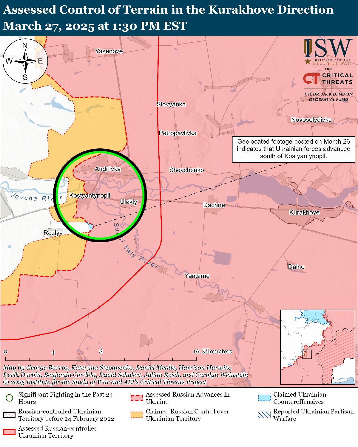 Оценка украинского продвижения: геолоцированные кадры, опубликованные 26 марта, указывают на то, что украинские войска недавно продвинулись к лесопосадке к юго-востоку от Константинополя (к западу от Курахово). [72]