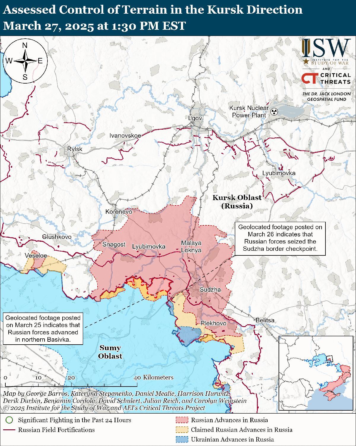 Оценка продвижения российских войск: геолоцированные кадры, опубликованные 27 марта, указывают на то, что подразделения российских 51-го и 137-го воздушно-десантных полков (оба входят в состав 106-й дивизии ВДВ) недавно захватили Гоголевку в Курской области (к западу от Суджи) и пограничный пункт пропуска «Суджа» (к юго-западу от Суджи на международной границе). [30] Дополнительные геолоцированные кадры, опубликованные 25 марта, указывают на то, что в последнее время российские войска продвинулись на северо-востоке Басовки Сумской области (к северо-востоку от Сум). [31]