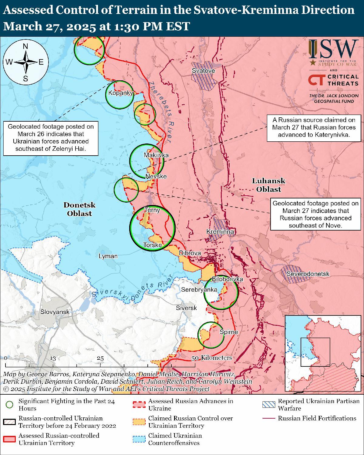 Оценка продвижения российских войск: геолоцированные кадры, опубликованные 27 марта, указывают на то, что российские войска недавно продвинулись к юго-востоку от Новое (к северо-востоку от Лимана). [52]