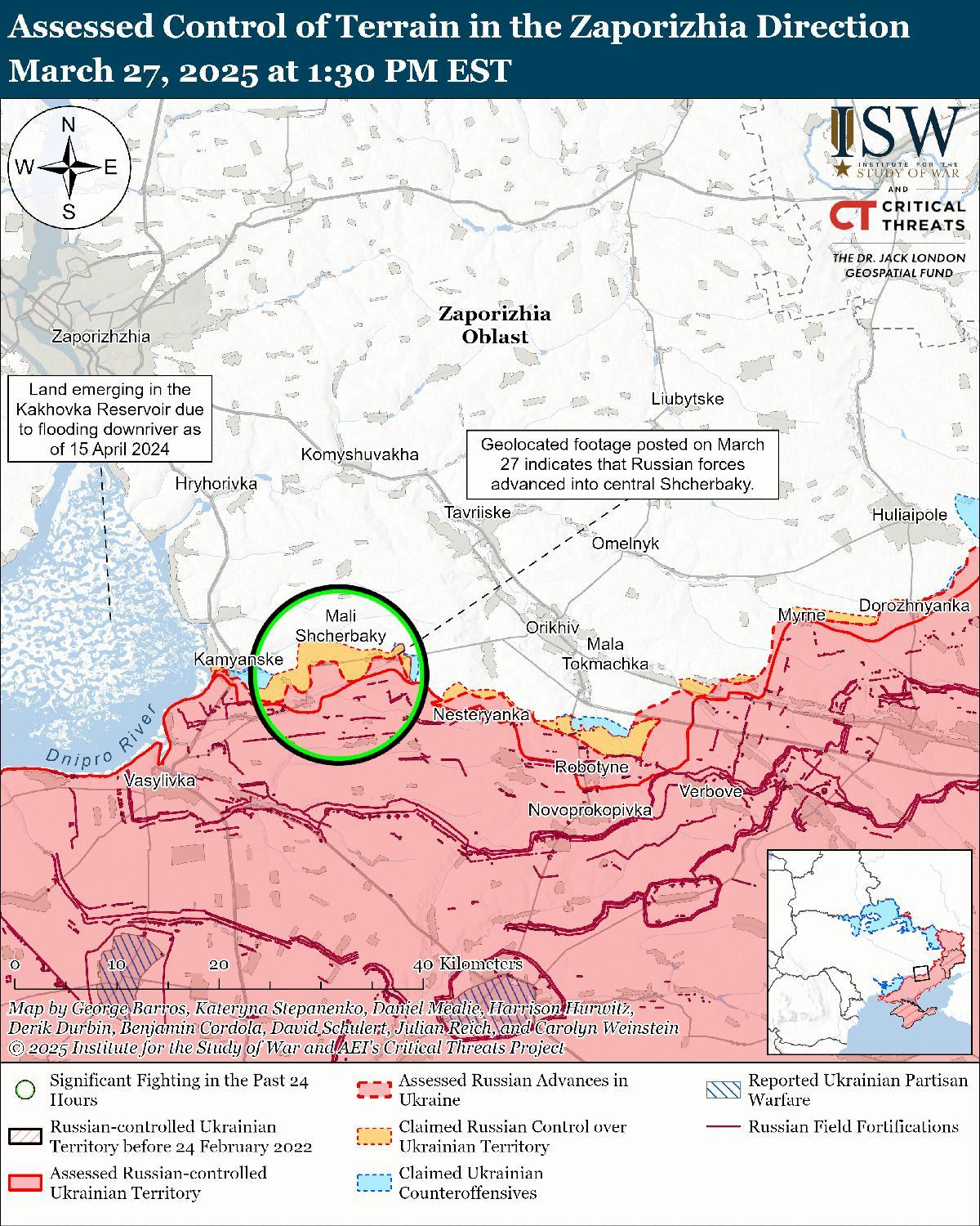 Оценка российского продвижения: геолоцированные кадры, опубликованные 27 марта, указывают на то, что части российской 19-й мотострелковой дивизии (58-я общевойсковая армия, Южный военный округ) недавно продвинулись в центральную часть Щербаки (к северо-западу от Работино). [82]