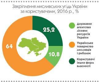 Площа наданих у користування мисливських угідь в Україні у 2016 році становить 39,4 млн га, з яких УТМР надано – 25,2 млн га (64%), підприємствам Держлісагентства – 4,2 млн га (10,8%), іншим користувачам – 9,9 млн га (25,2%).