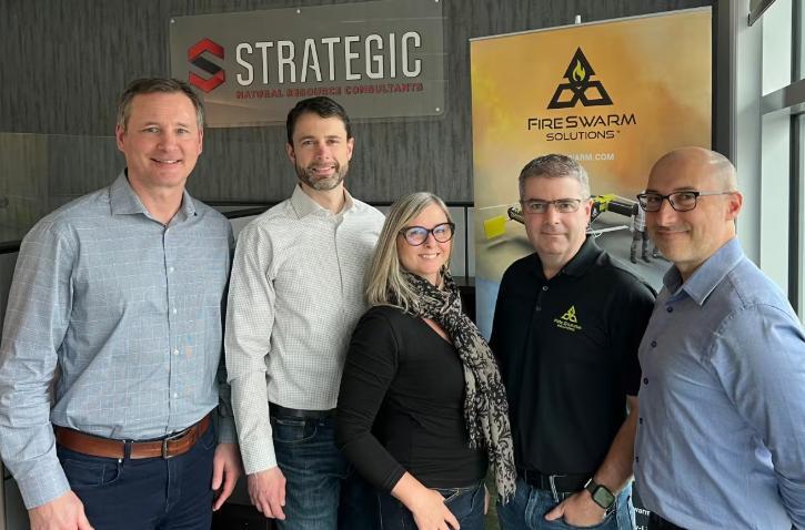 Четверо мужчин и женщина улыбаются, позируя для фотографии перед баннерами компании.Руководство Fireswarm и Strategic Natural Resource Group. (Предоставлено Мелани Битнер)