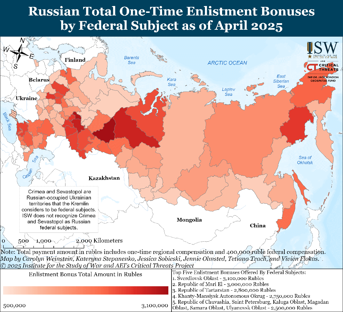 Субъекты Российской Федерации продолжают использовать динамическое ценообразование при единовременном премировании при поступлении на военную службу для стимулирования привлечения добровольцев. Глава Республики Башкортостан Радий Хабиров объявил 29 апреля, что до 15 мая регион продолжит выплачивать единовременную премию в размере 1,6 миллиона рублей (19 717 долларов США) лицам, подписавшим контракты о прохождении военной службы в Министерстве обороны Российской Федерации. [21] Республика Башкортостан ранее объявила, что это предложение будет действовать с 1 января по 31 марта, а затем продлила его до конца апреля. [22]