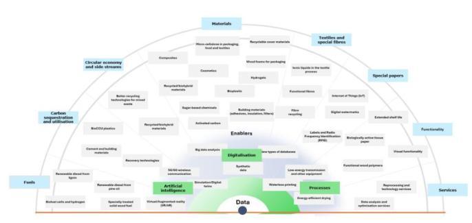 Интересно и немного удивительно, что центральным элементом на рисунке является не «древесина», а «данные». Лесная промышленность является и будет оставаться переработчиком древесины, но все чаще она становится также пользователем и переработчиком данных. Например, перерабатывающие предприятия этого сектора используют интернет вещи и машинное обучение для автоматизации процессов, что позволяет сократить потребление энергии и воды и повысить производительность. Данные и искусственный интеллект также используются в начале цепочки создания стоимости, в лесопользовании. Это может улучшить урожайность лесов и раннее обнаружение повреждений лесов, например.