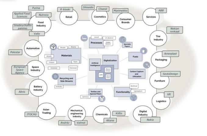 Из чего состоит успешная экосистема лесной промышленности? На рисунке, представляющем финскую экосистему, есть два особенно важных элемента. Во-первых, он показывает ядро, состоящее из крупных компаний сектора. Во-вторых, ветви, отходящие от ядра, ведут к многочисленным более мелким компаниям. Крупные компании лесной промышленности действуют как двигатели инновационной экосистемы, предоставляя более мелким компаниям доступ к научно-исследовательскому сотрудничеству, финансированию, производственным платформам и международным рынкам.