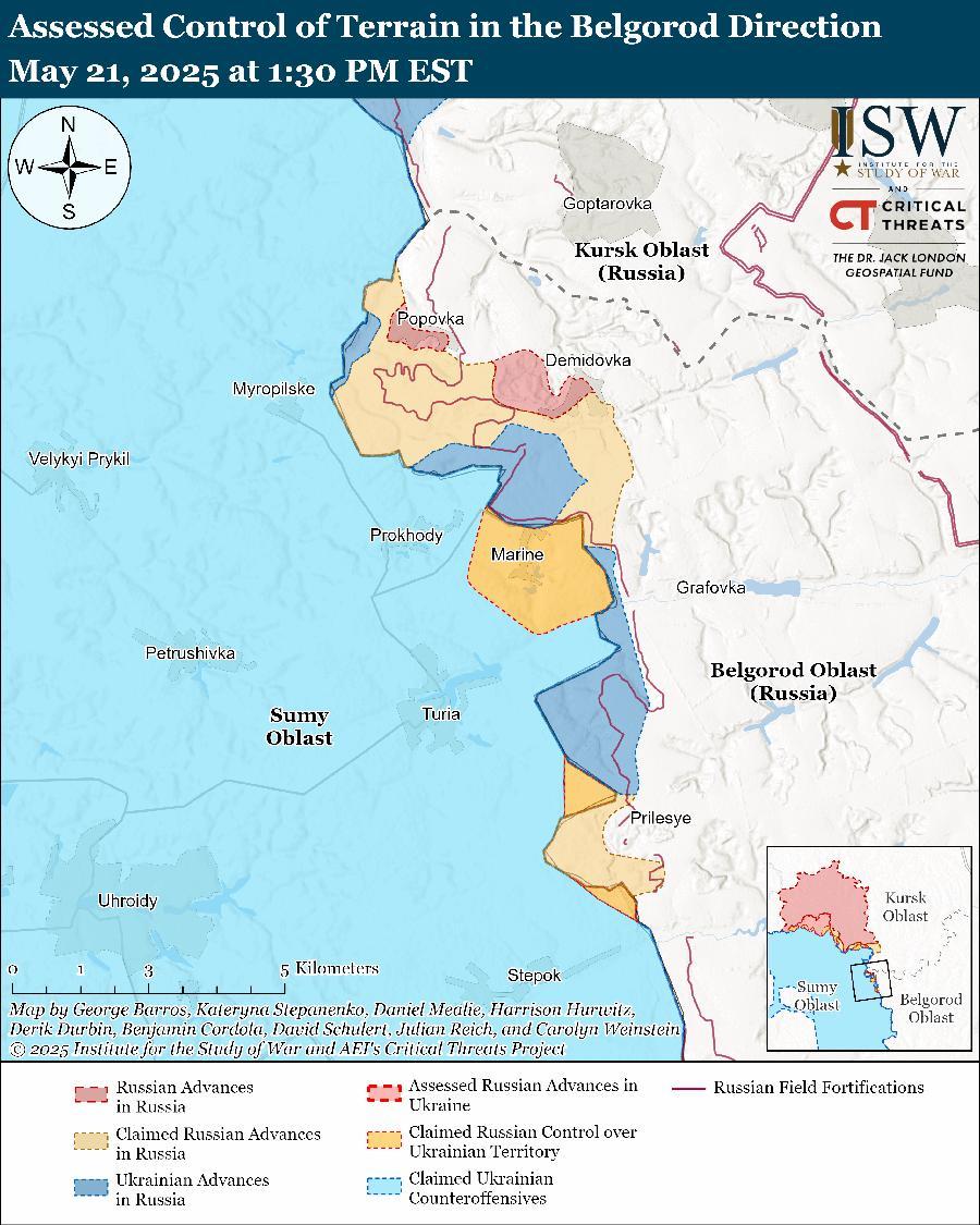 Президент России Владимир Путин, вероятно, организовал встречу с официальными лицами Курской области 20 мая, чтобы выработать условия, оправдывающие возобновление российских планов по захвату Сум и незаконной аннексии Сумской области. 20 мая Путин встретился с руководителями муниципальных образований Курской области, в ходе которой глава Глушковского района Павел Золотарев попросил Путина создать буферную зону в Сумской области. [1] Путин спросил, на сколько километров должна быть эта буферная зона, и Золотарев заявил, что Россия должна захватить «как минимум Сумы», и намекнул, что Россия должна быть «больше». [2] Позже исполняющий обязанности губернатора Курской области Александр Хинштейн ответил на это в своем Telegram-канале, заявив, что его дед родом из Сумской области, поэтому «эта земля для него не чужая». [3] Город Сумы находится примерно в 25 километрах от международной границы, и буферная зона, достаточно глубокая, чтобы включить город Сумы, не позволит украинским силам наносить удары ствольной артиллерии и тактических беспилотников по территории России. Западные и украинские источники сообщили, что российская делегация на украинско-российских переговорах 16 мая в Стамбуле пригрозила захватом Сумской области с целью создания «зоны безопасности». [4] ISW продолжает считать, что у России есть территориальные цели за пределами областей, которые Россия уже незаконно оккупировала или аннексировала, и что Путин, возможно, намерен использовать дальнейшее продвижение в Сумской области, чтобы потребовать от Украины уступить часть Сумской области России во время будущих мирных переговоров. [5]