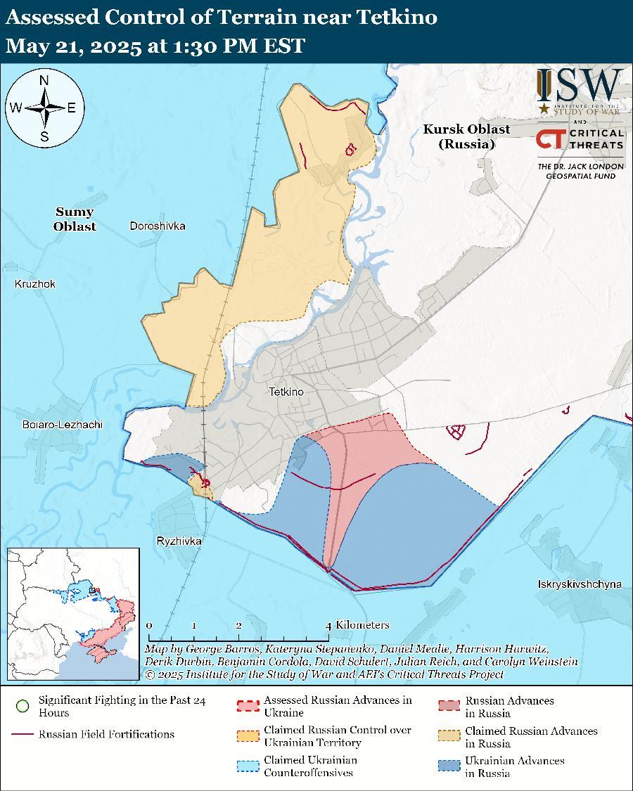 Вероятно, Кремль организовал взаимодействие на встрече 20 мая, чтобы представить Путина как эффективного и заинтересованного лидера военного времени, отвечая на российские просьбы о дальнейшем продвижении в Сумской области и предполагая, что Россия претендует на большую территорию в Украине. Визит Путина в Курскую область 20 мая впервые с тех пор, как 26 апреля Россия объявила о военной победе в регионе. [6] В ISW поступили сообщения о том, что украинские войска сохраняют ограниченные позиции в Курской области, несмотря на официальные заявления Кремля о том, что российские войска полностью вытеснили украинские войска из области. [7] Генеральный штаб Украины 21 мая сообщил, что украинские войска продолжают активные боевые действия в Курской области. [8] Путин также встретился с исполняющим обязанности губернатора Курской области Александром Хинштейном и договорился продолжить федеральное финансирование местных жителей и увеличить масштабы работ по разминированию. [9] Встреча Путина с Хинштейном является частью продолжающихся усилий Кремля изобразить Путина как эффективного и заботливого лидера военного времени и преуменьшить неудачи России на украинском театре военных действий. [10]