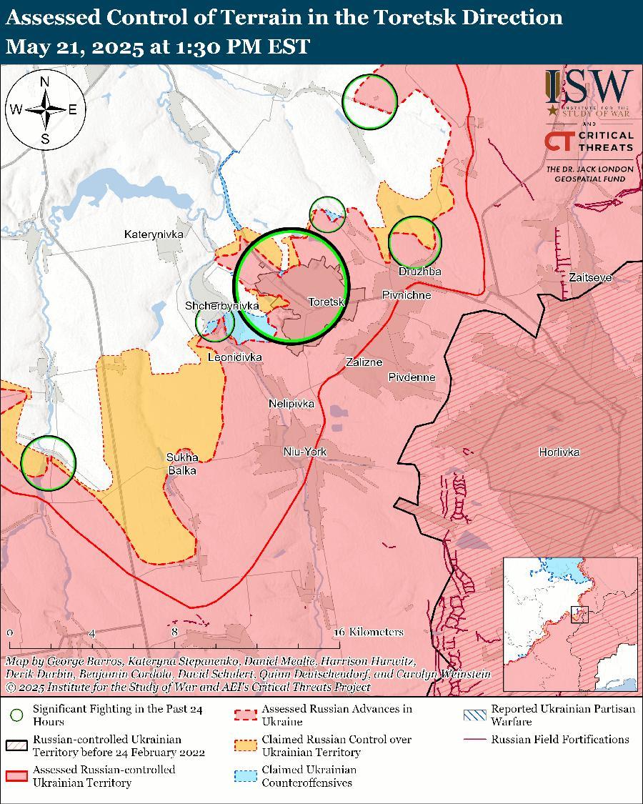 Российские войска вели наступательные действия в районе самого Торецка; восточнее Торецка у Дружбы; северо-восточнее Торецка в районе Дилиевки; к юго-западу от Торецка в районе Новоспасского (бывшее Петровка), Старой Николаевки, Гнатовки, Новой Полтавки и Александрополя, а также в направлении Зари; и к западу от Торецка в районе Новооленовки и в направлении Яблунивки 20 и 21 мая. [70]